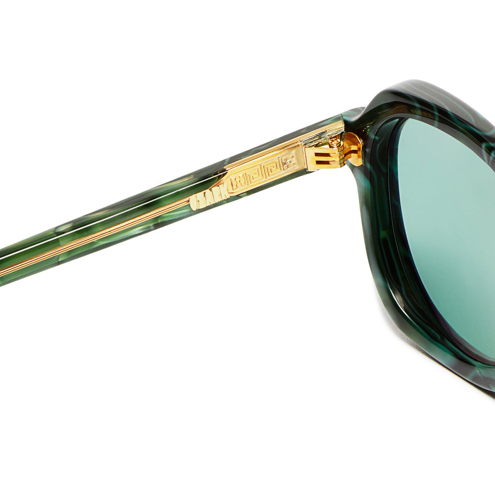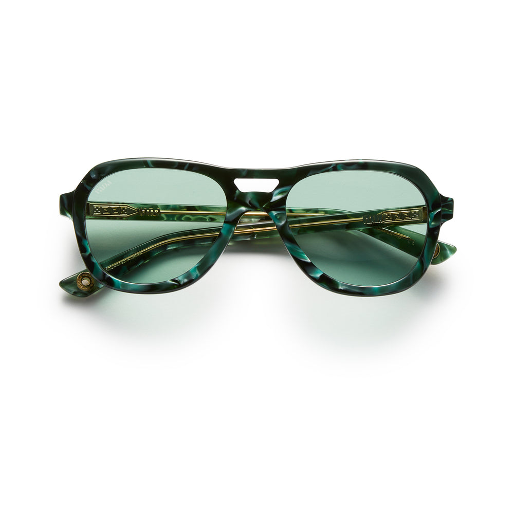 Stylish aviator-style sunglasses featuring a distinctive marbled green acetate frame with a luxurious tortoise-like pattern. The frame has a substantial build with smooth curves and a classic bridge design. The lenses are a matching sage green tint that complements the frames coloring. The design offers a sophisticated, retro-inspired look that would suit many face shapes.