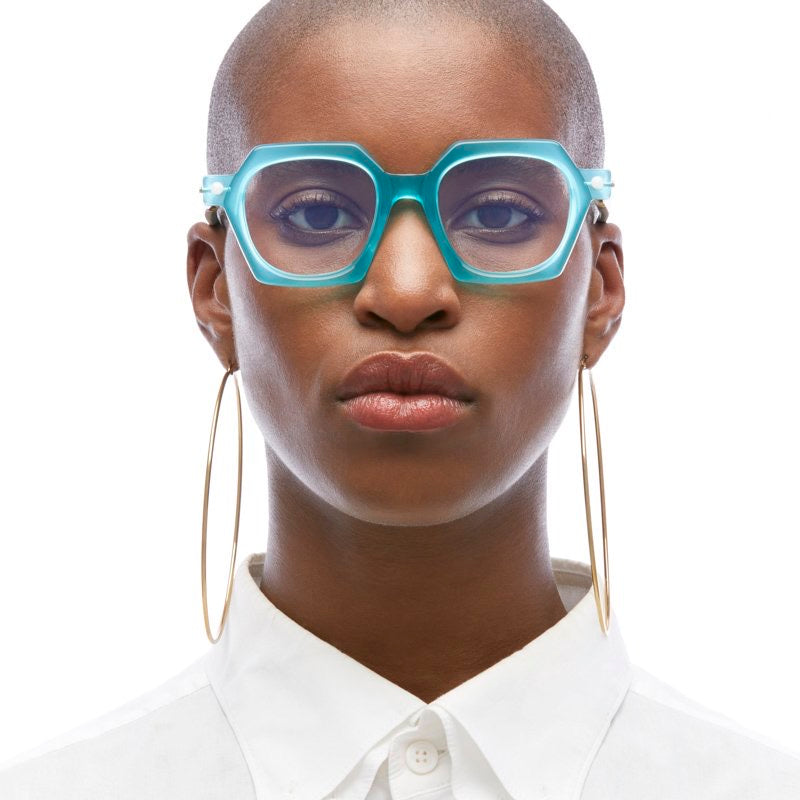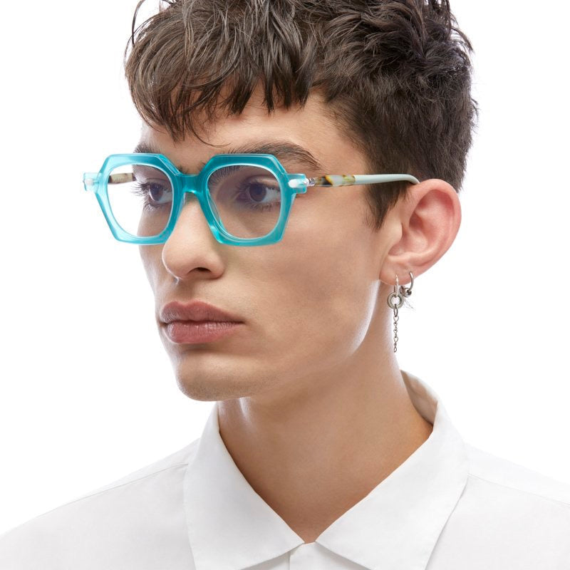 These striking geometric frames feature an unconventional hexagonal shape in a translucent turquoise/aqua blue colorway. The frames have a modern, architectural quality with sharp angles and clean lines. Made from high-quality transparent plastic with a medium thickness throughout, these bold statement glasses showcase an avant-garde aesthetic while maintaining wearability. The design has a continuous flow from front to temples with integrated hinges and a contemporary minimalist appeal.