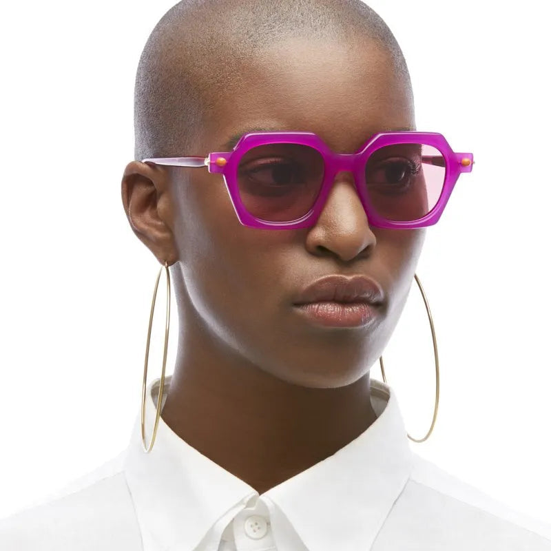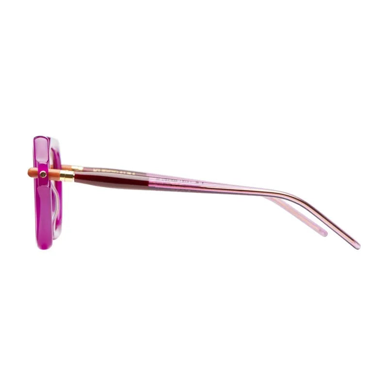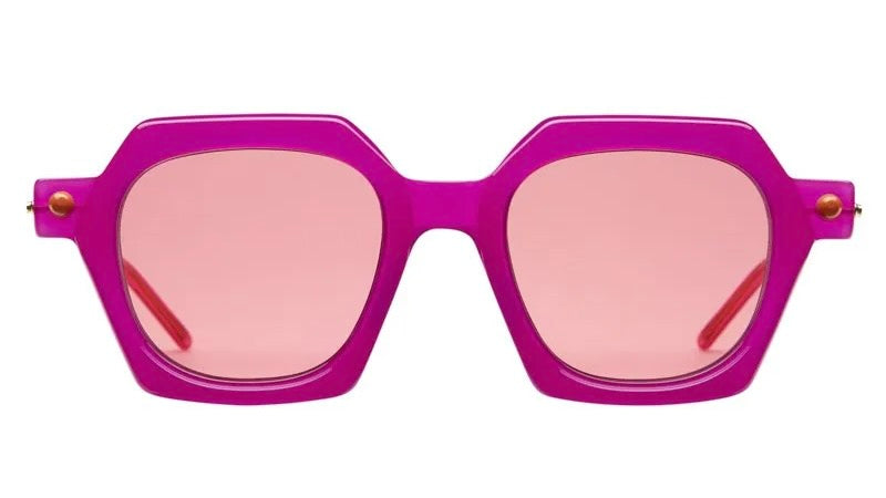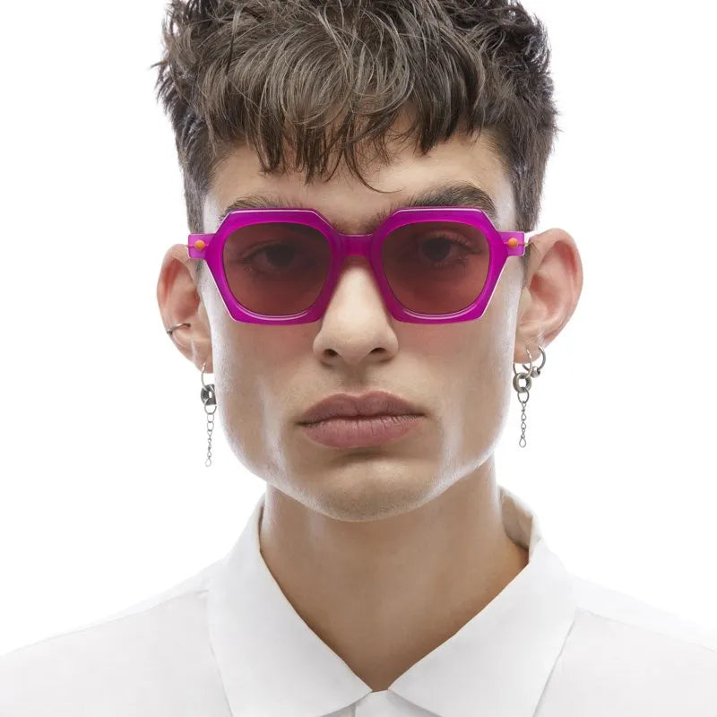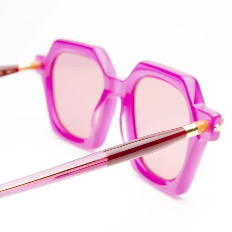 Striking oversized geometric sunglasses featuring a bold magenta/purple acetate frame with an avant-garde angular silhouette. The thick, architectural design showcases clean lines and sharp angles, complemented by pink-tinted lenses. Small metallic gold accents at the temple hinges add a subtle luxurious detail. The design exhibits a contemporary, fashion-forward aesthetic with substantial frame construction and a distinctive geometric shape that makes a bold statement.