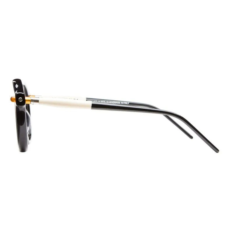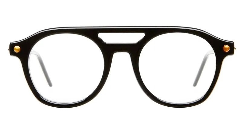 These striking avant-garde glasses feature a bold geometric frame design with a distinctive double bridge and prominent top bar. The frame has a sophisticated matte black finish with subtle gold accent studs at the temples. The substantial acetate construction gives these frames a strong architectural presence while maintaining a wearable, fashion-forward aesthetic. The rounded lower portion of the lenses contrasts nicely with the angular upper design elements, creating an intellectual yet edgy look suitable for creative professionals.