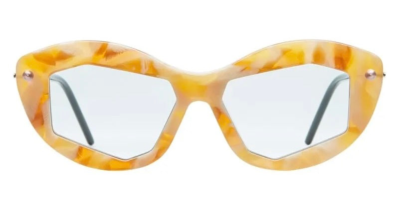 These are bold statement cat-eye glasses featuring a chunky tortoiseshell acetate frame in honey and amber tones. The distinctive angular geometric cut of the lenses creates a dramatic, avant-garde silhouette. The frames have a substantial, architectural quality with clean lines and sharp angles that give them a high-fashion, artistic appeal. Small metallic rivets accent the front corners, adding a subtle industrial detail to the otherwise organic tortoise pattern.