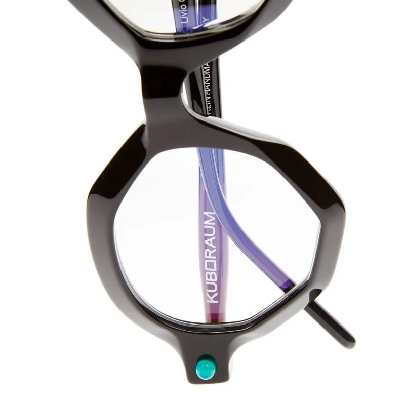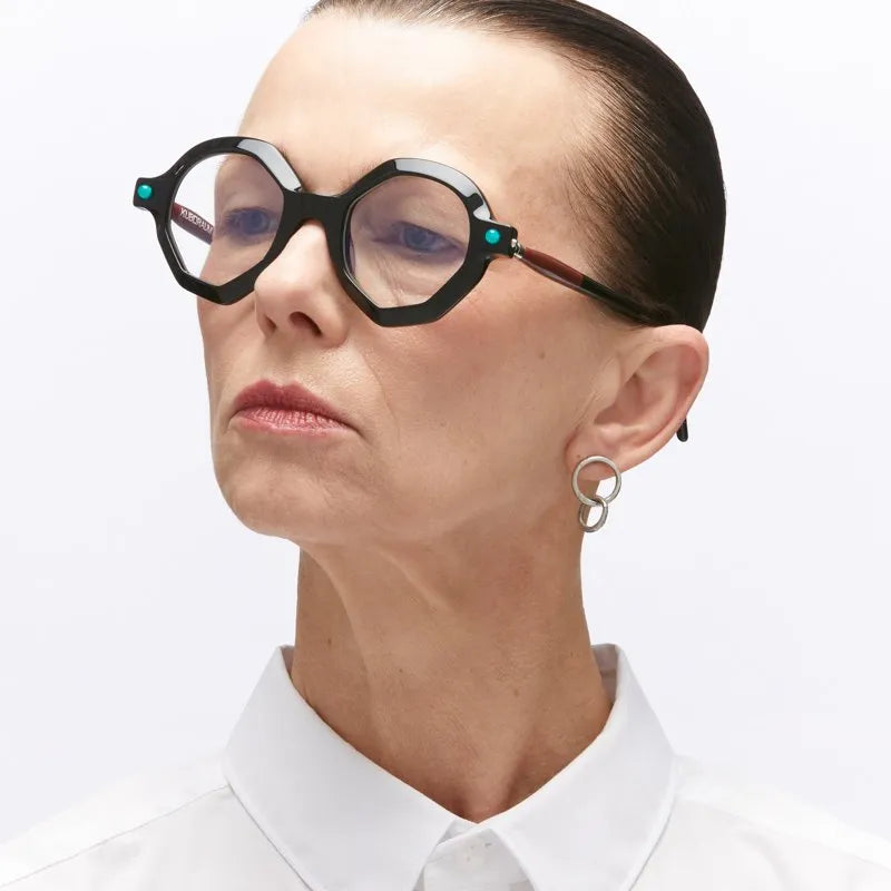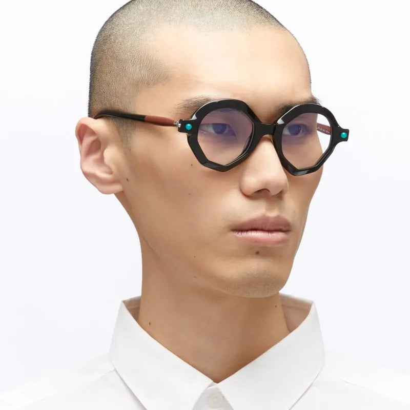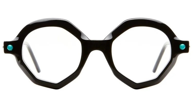 These are striking avant-garde glasses featuring a bold geometric hexagonal frame design. The thick black plastic construction creates a dramatic, architectural look. Small turquoise accents appear on the temples, adding an unexpected pop of color to the otherwise monochromatic design. The frames have a contemporary, artistic quality with sharp angles and a substantial presence. The oversized lenses and dramatic shape make these glasses a strong statement piece that would appeal to those seeking unique, fashion-forward eyewear.