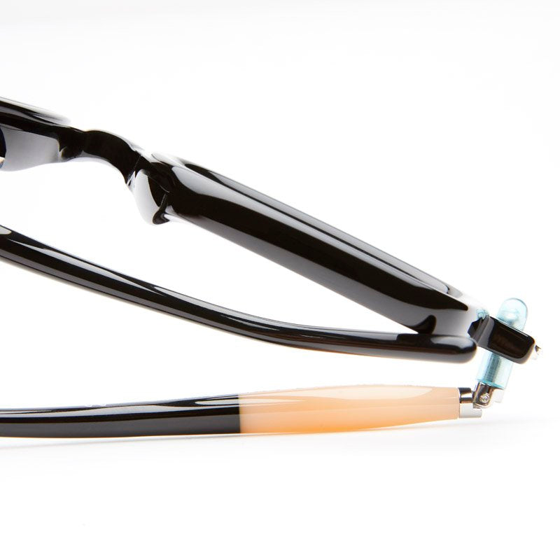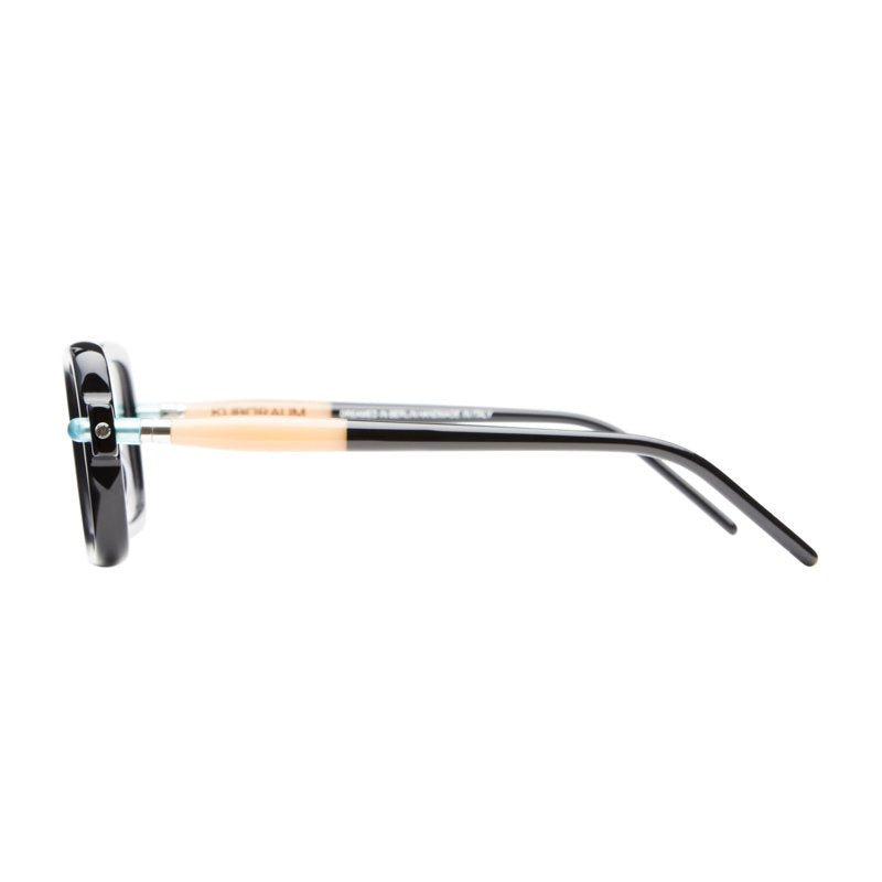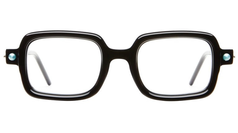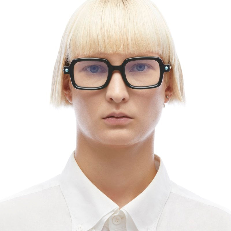 These bold, statement eyeglasses feature a distinctive chunky square frame with a retro-modernist aesthetic. The frame has a striking architectural quality with its thick, substantial build and clean geometric lines. Small turquoise/blue accent dots on the temple hinges add a subtle pop of color to the otherwise all-black design. The oversized square lenses and bold bridge create a strong intellectual/artistic look thats both vintage-inspired and contemporary. The temple arms maintain the substantial width of the front frame, creating a cohesive bold appearance throughout.