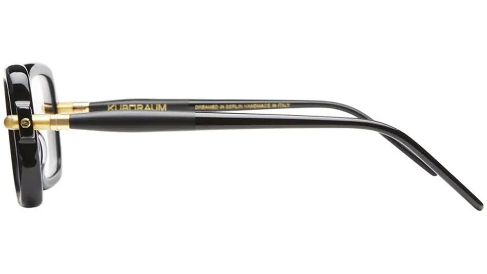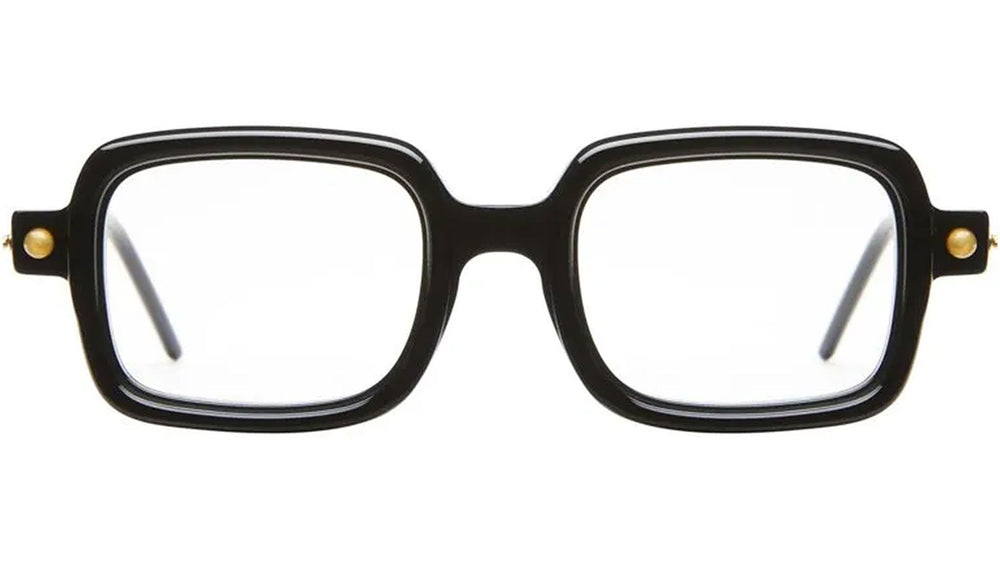 These bold, architectural eyeglasses feature a striking geometric square shape with chunky black acetate frames. The design has a distinctive retro-futuristic aesthetic with its oversized proportions and bold straight lines. Small gold accent studs on the temples add a subtle luxurious detail. The thick, substantial build suggests durability while maintaining a fashionable avant-garde look typical of KUBORAUMs design philosophy.