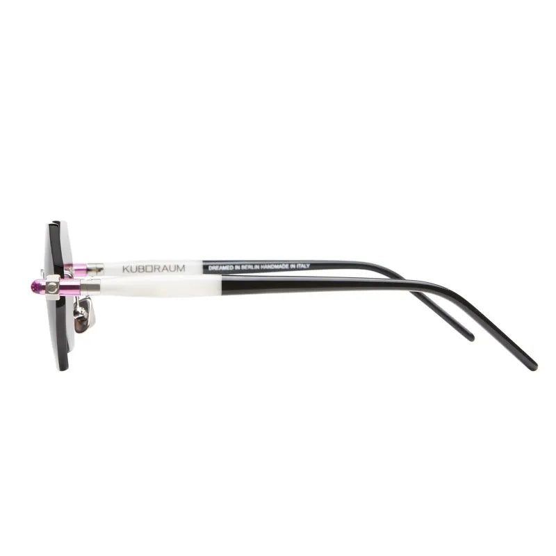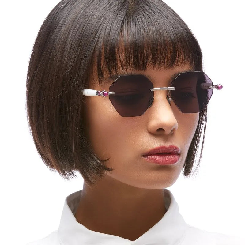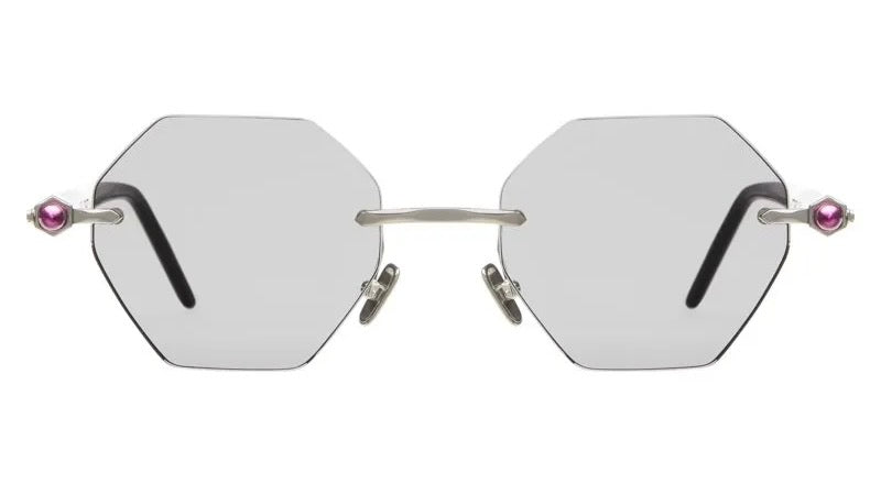 Distinctive frameless geometric sunglasses with hexagonal lenses and minimalist silver metal construction. Features small purple jewel accents on temple hinges, adding a subtle artistic touch. The design exhibits clean lines with thin metal arms and nose pads for a lightweight, contemporary aesthetic. The transparent lenses and understated metalwork create an avant-garde yet wearable style suitable for fashion-forward individuals.