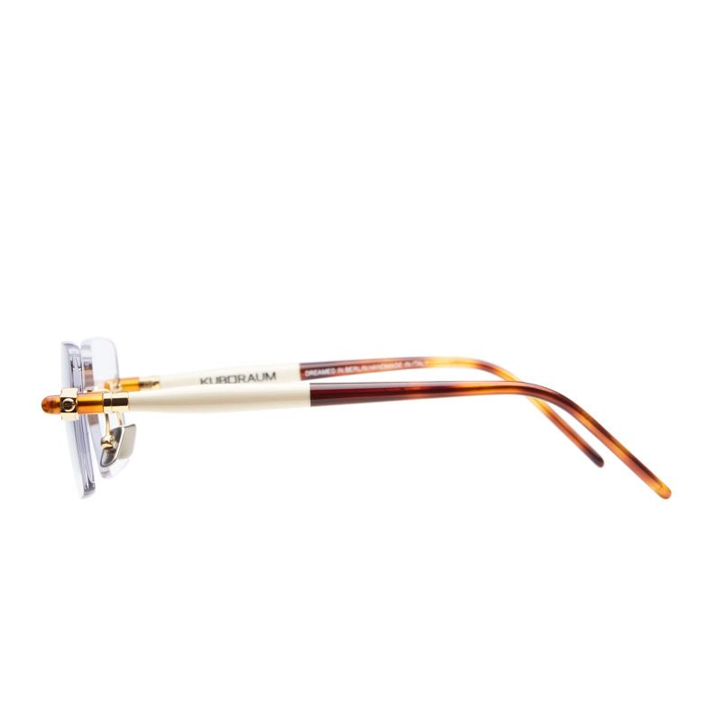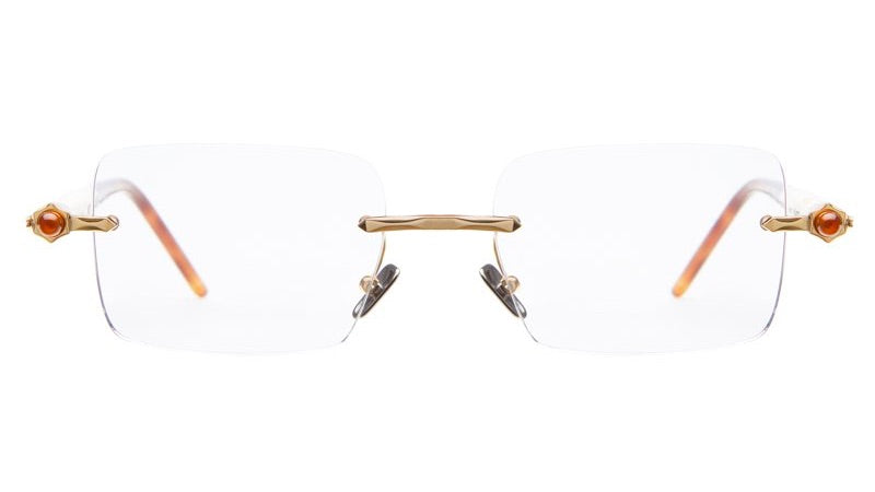 These are elegant rimless rectangular glasses with a minimalist design. The frameless lenses are held by a delicate gold-tone metal structure. Small decorative amber or orange-colored accents appear on the temple hinges, adding a subtle touch of sophistication. The temple arms feature a sleek design that transitions from metal to what appears to be acetate tips in a complementary warm tone. The nose pads are adjustable for comfort, and the overall design presents a sophisticated, lightweight appearance ideal for professional or formal settings.