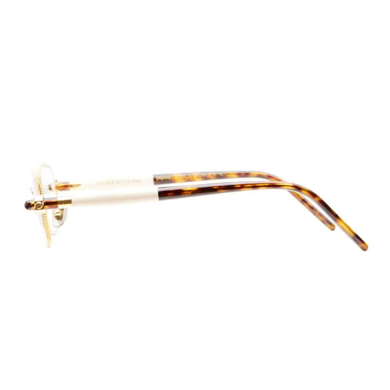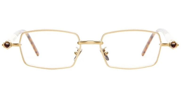 Luxurious rectangular gold-tone metal eyeglasses with delicate wire frame construction. Features minimalist design with fine textured detailing on the temple arms and small decorative black gemstones at the temple hinges. The slim profile and architectural aesthetic gives these frames a sophisticated, avant-garde appearance suitable for fashion-forward individuals. The adjustable nose pads and lightweight build ensure comfortable wear.