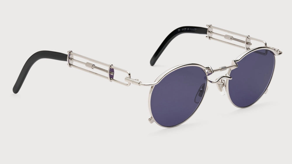These elegant round sunglasses feature a distinctive silver metallic frame with a minimalist design. The frames have a unique screw-like detail on the temples, characteristic of the Jean Paul Gaultier aesthetic. The deep purple lenses are complemented by the sleek silver frame, creating a sophisticated and timeless look. The nose pads and thin temple arms maintain a lightweight, comfortable fit. The overall design balances vintage inspiration with modern refinement, making them suitable for various face shapes and styles.