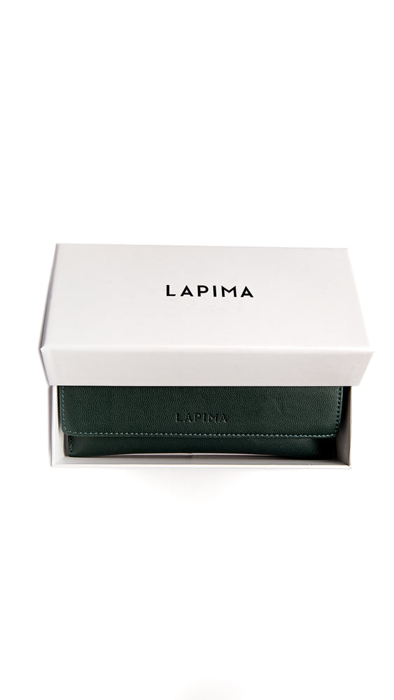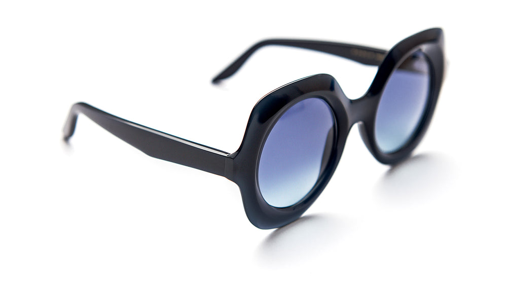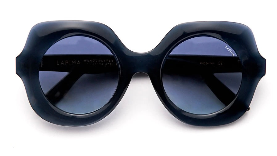 These striking oversized round sunglasses from LAPIMA feature a bold, sculptural acetate frame with a thick profile. The handcrafted design has an artistic, avant-garde aesthetic with dramatic curved temples and a chunky silhouette. The dark lenses fade from black to grey in a subtle gradient. The substantial saddle bridge and wide temple arms create a powerful, statement-making look thats both luxurious and fashion-forward. The glasses showcase LAPIMAs attention to detail and premium craftsmanship.
