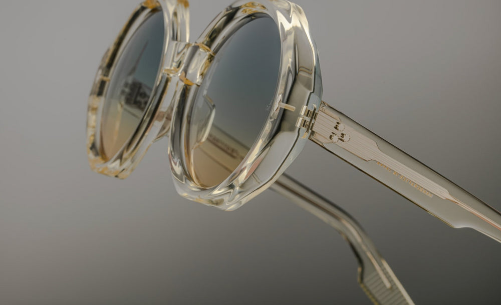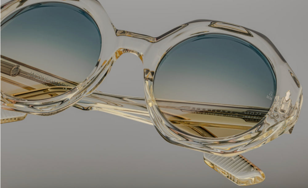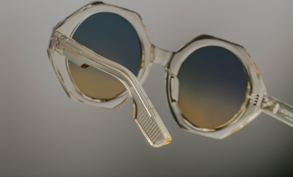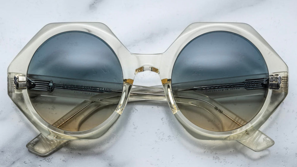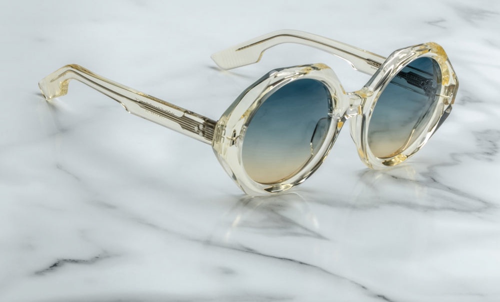 These are striking oversized geometric sunglasses with a translucent crystal-clear frame that has a modernist architectural quality. The lenses feature a sophisticated gradient effect transitioning from blue-grey to beige. The frame has distinctive angular cuts and facets that create an avant-garde, artistic appearance. The chunky temples and bold geometric shape make these sunglasses a standout statement piece with a luxury vintage-inspired aesthetic.