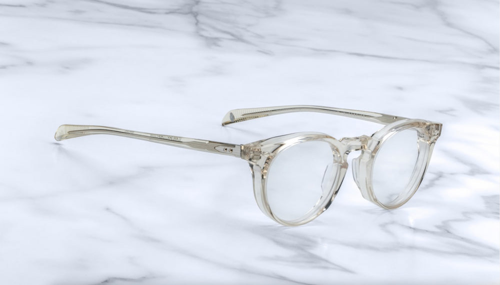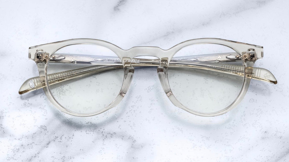 These are sophisticated round-framed glasses with a translucent grey acetate construction. The frame exhibits a refined vintage-inspired design with a medium-thick profile and clean lines. The clear crystal-like finish gives them a modern, sophisticated appearance. The temples feature metal accents, adding a subtle luxurious detail. The overall aesthetic is minimalist yet elegant, perfect for both professional and casual settings. The proportions are well-balanced with a classic saddle bridge that complements the round silhouette.