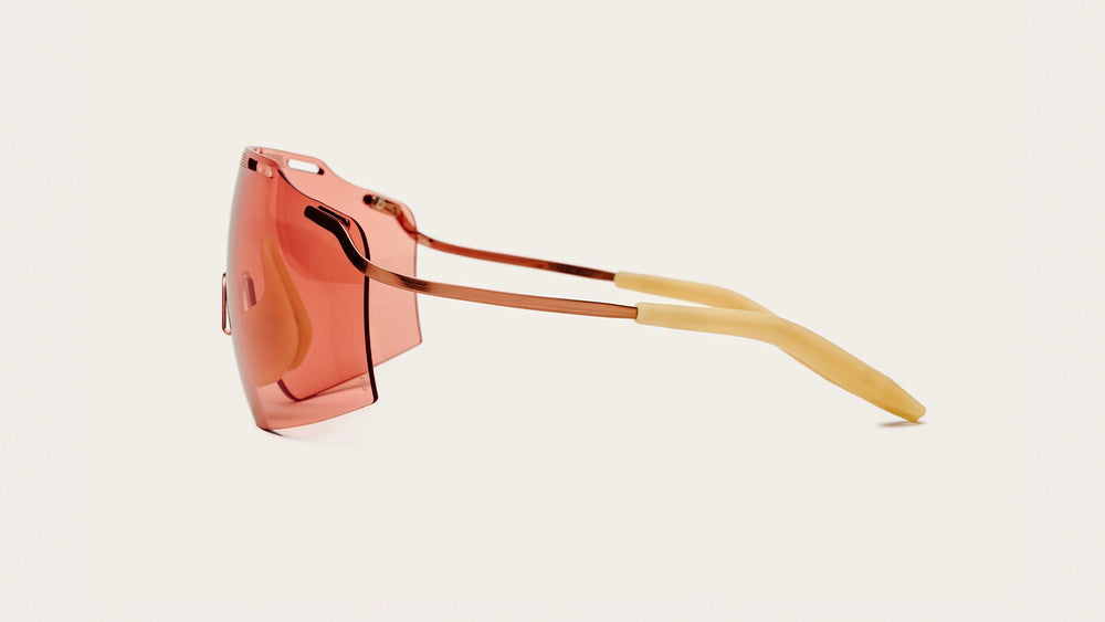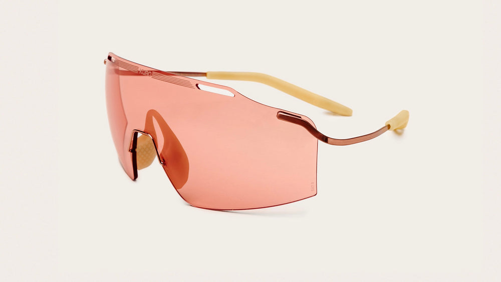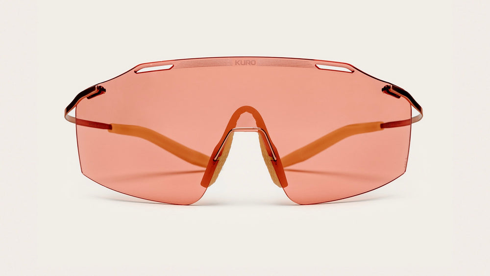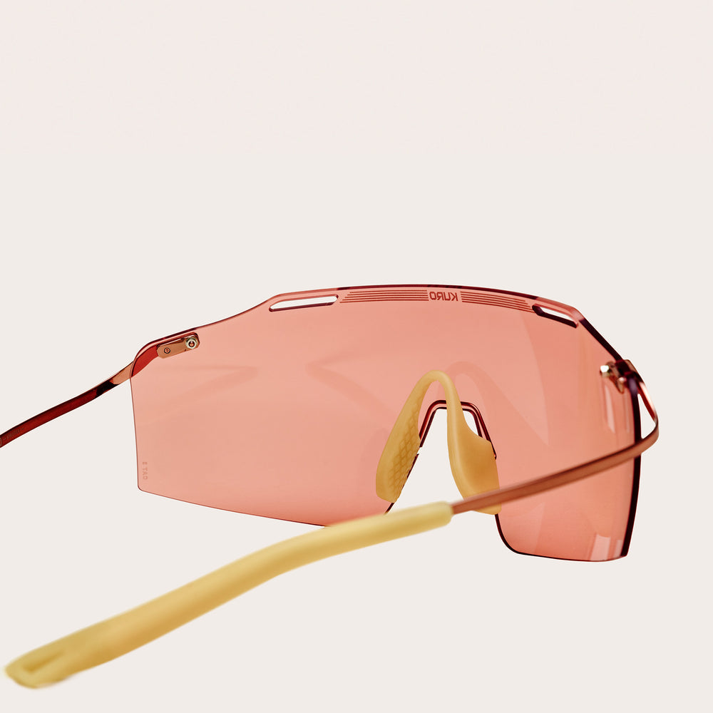 A sleek, minimalist sports performance shield-style eyewear with a single-piece pink-tinted lens. The frameless design features an aerodynamic curved lens shape with subtle KURO branding. The lightweight metal construction includes adjustable nose pads and slim temple arms that likely provide a secure fit during athletic activities. The pink tint offers a fashionable yet functional aesthetic suitable for both casual and athletic wear.