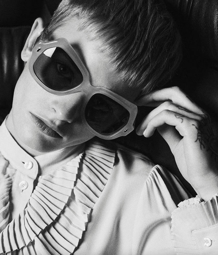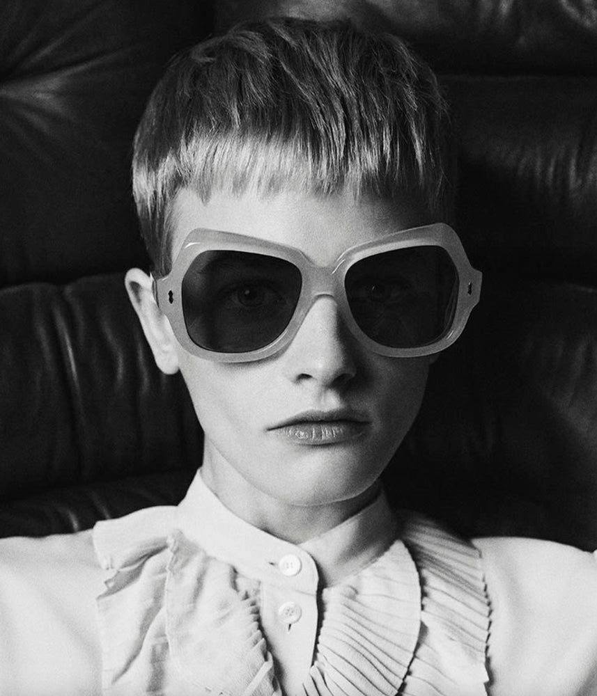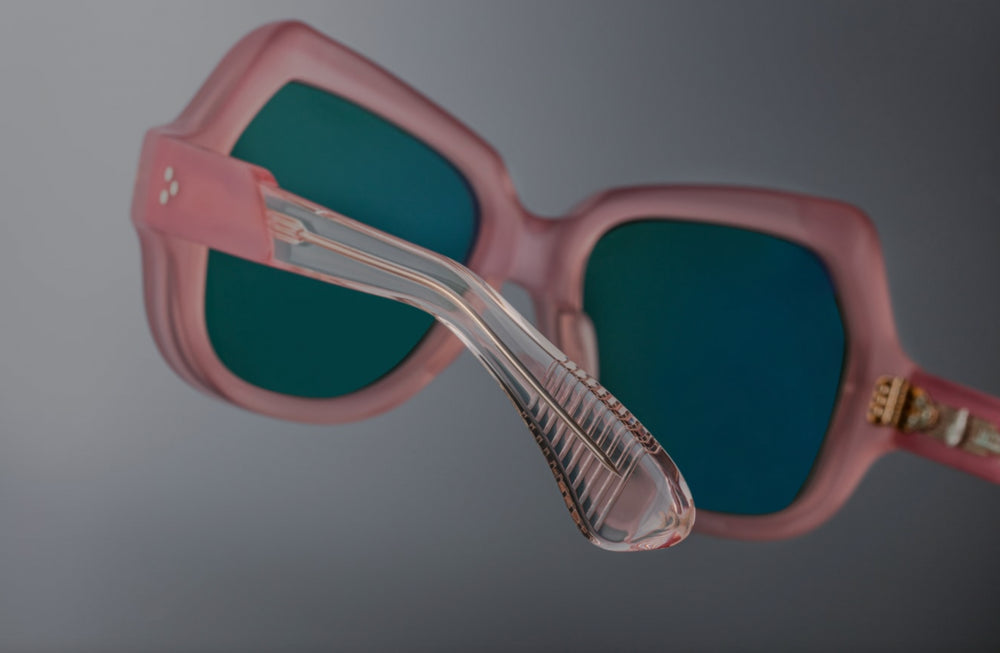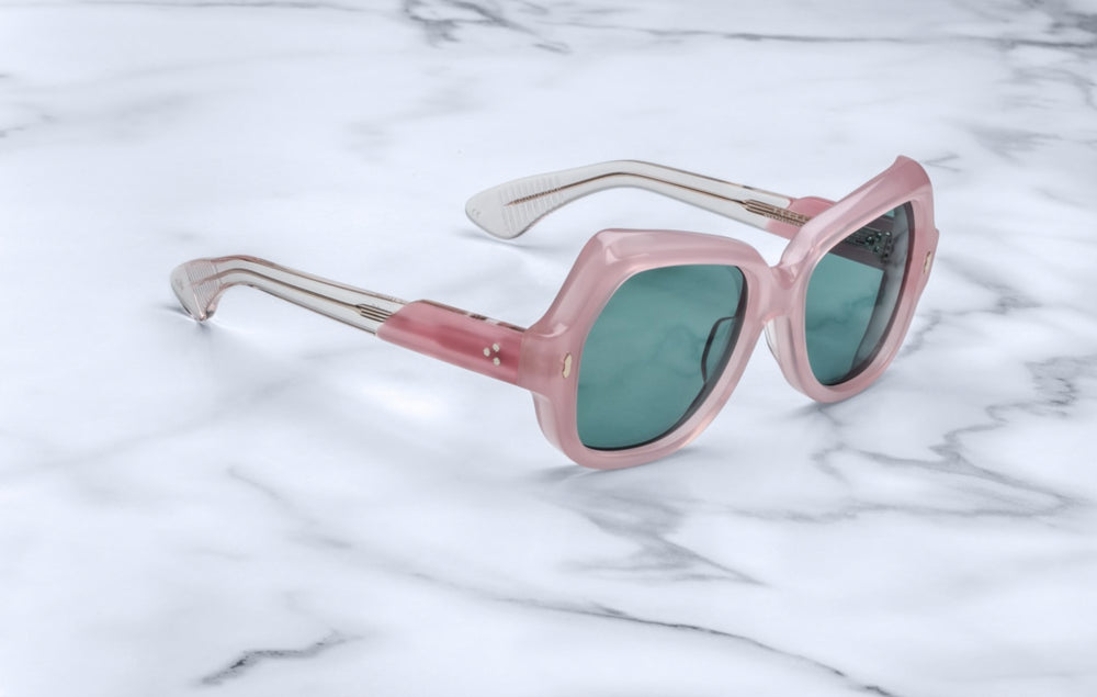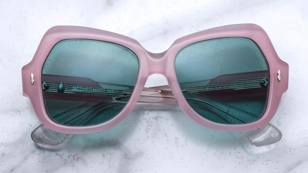 A luxurious oversized geometric frame in a matte rose pink colorway from Jacques Marie Mages Perreti collection. The sunglasses feature substantial thick frames with bold angular cuts, green-tinted lenses, and distinctive architectural temple arms. The design incorporates subtle decorative studs at the front corners, creating an elegant vintage-inspired aesthetic with a modern twist. The oversized silhouette and premium construction speak to high-end craftsmanship and sophisticated styling.
