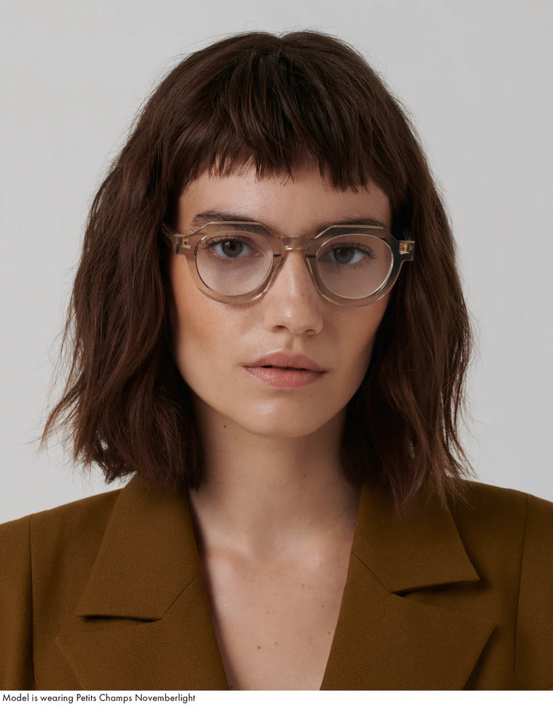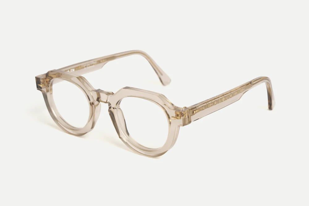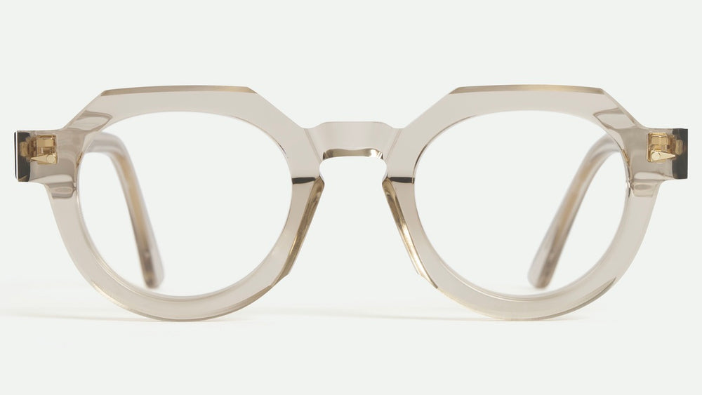 These distinctive eyeglasses feature a bold round frame in a sophisticated translucent grey acetate. The design showcases a sculptural approach with a substantial frame thickness and clean lines. The frame has an architectural quality with squared-off edges and gentle curves, creating a contemporary yet timeless aesthetic. Small gold-toned hardware details at the temples add a subtle luxurious accent to the otherwise minimalist design. The saddle bridge provides comfortable fit while maintaining the frames modern aesthetic.