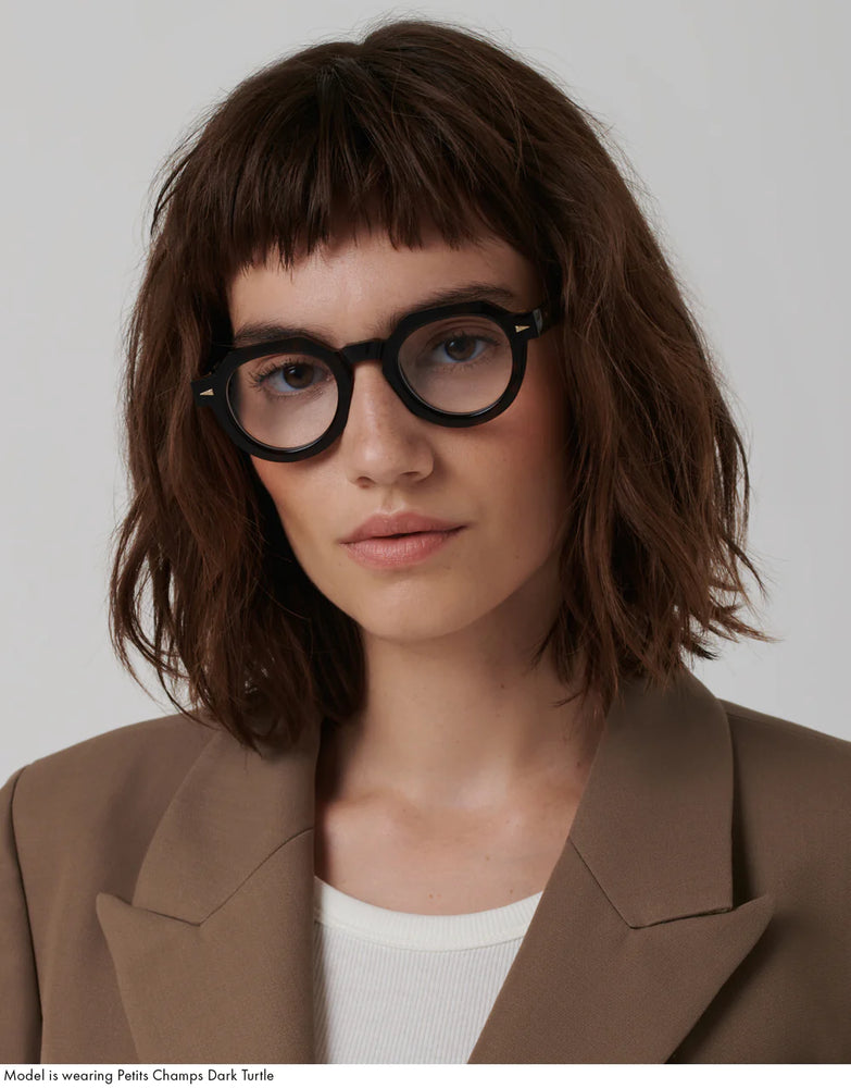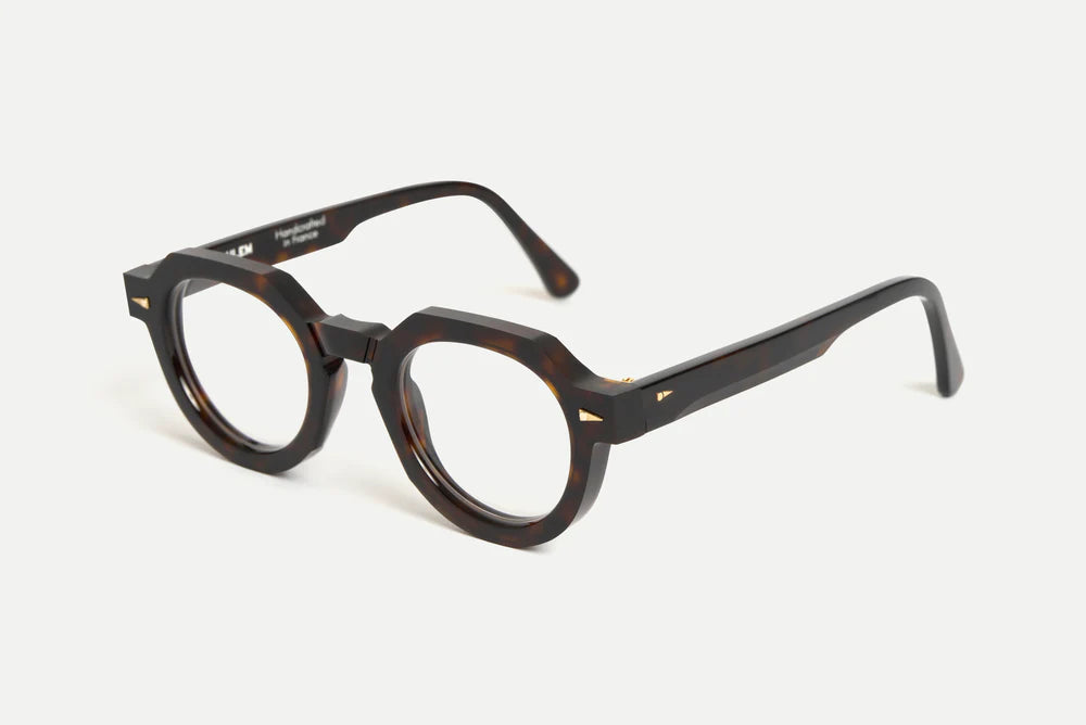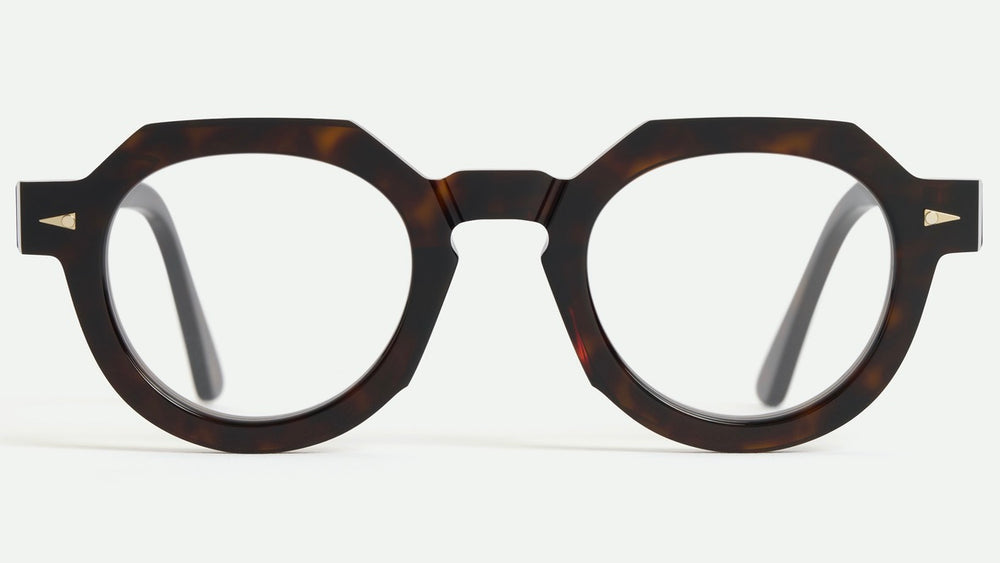 These are bold round-framed glasses with a distinctive geometric aesthetic. The thick tortoiseshell acetate frame features a strong, architectural design with angular elements at the temples. Small decorative metal arrow details adorn the front corners, adding a subtle luxurious accent. The glasses have a vintage-inspired silhouette with a contemporary twist, characterized by their substantial rim thickness and pronounced saddle bridge. The dark tortoiseshell pattern shows rich variations of brown and amber tones throughout the frame.