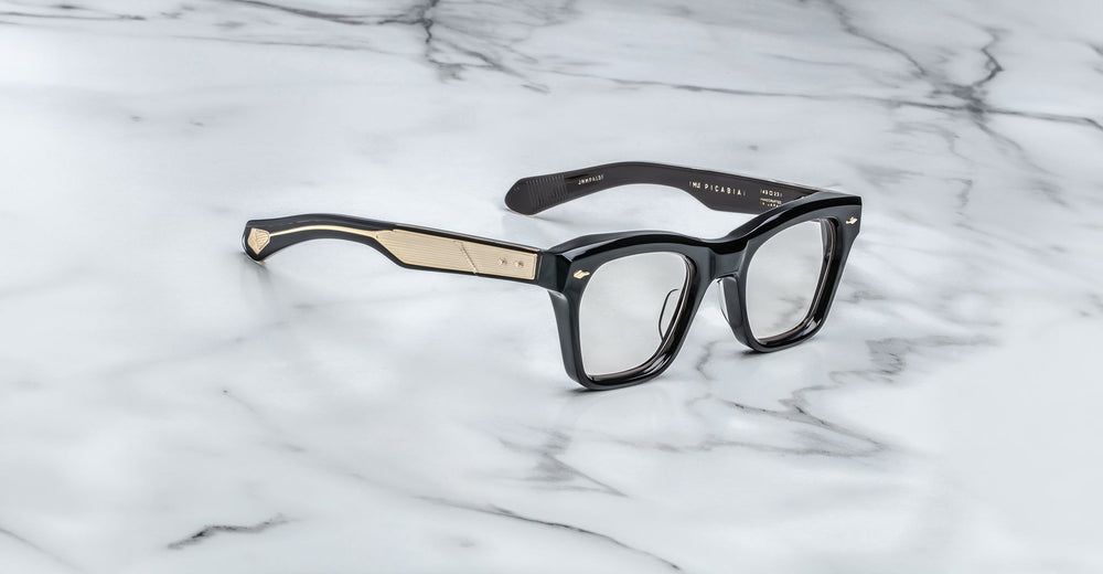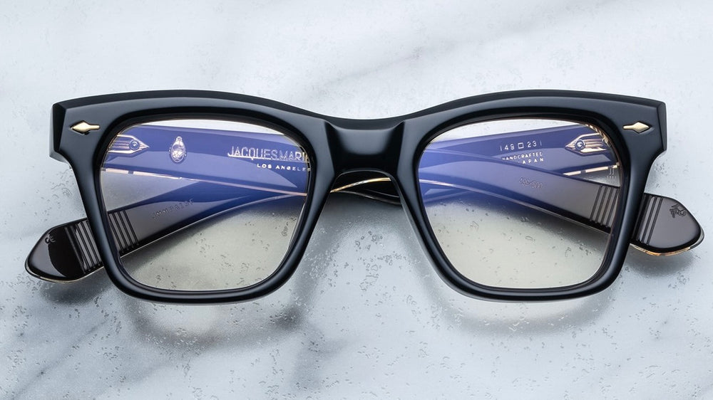 A sophisticated pair of Jacques Marie Mage square frames featuring a bold, chunky acetate construction in classic black. The frames showcase a distinctive architectural design with sharp angles and a pronounced squared-off shape. Small metallic accents at the front corners add subtle luxury detailing. The substantial temple arms maintain the bold aesthetic while the saddle bridge provides comfortable fit. These glasses embody a vintage-inspired yet contemporary aesthetic typical of JMMs luxury eyewear design philosophy.