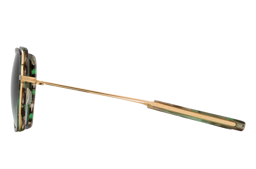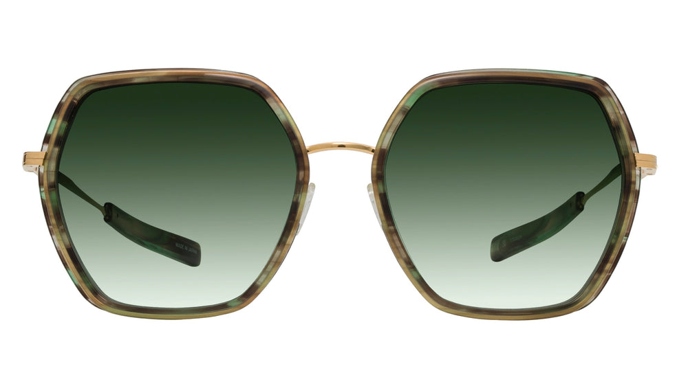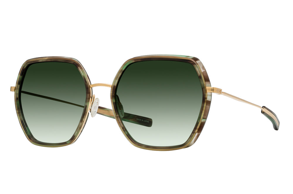Luxurious hexagonal-shaped sunglasses featuring a tortoiseshell acetate frame front combined with gold-tone metal details. The distinctive geometric silhouette is complemented by gradient green lenses that fade from dark to light. The design showcases elegant proportions with clean lines and sophisticated metal temple arms. The glasses exhibit premium craftsmanship with refined details and a balanced aesthetic that works well for any face shape. The combination of tortoiseshell pattern and gold metal creates a versatile, high-end look suitable for both casual and formal occasions.