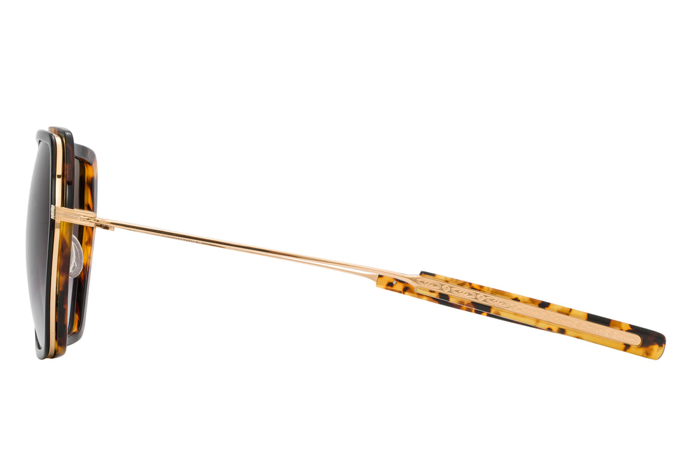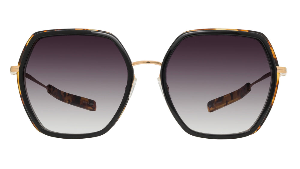 These sophisticated oversized geometric sunglasses feature a black and gold metal frame with elegant tortoiseshell temple tips. The gradient grey lenses are housed in a distinctive angular hexagonal shape with a sleek metallic bridge. The design combines modern geometric styling with classic luxury materials, creating a bold yet refined aesthetic suitable for any occasion.
