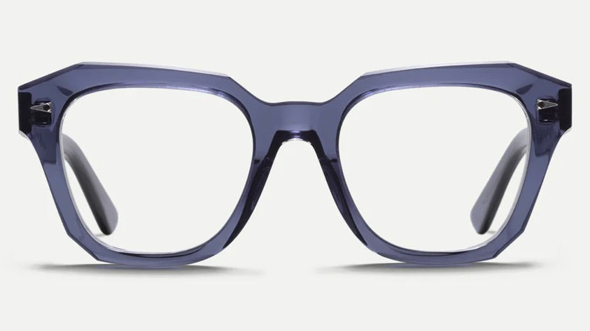 These are bold contemporary eyeglasses featuring a chunky transparent blue acetate frame with a distinctive geometric square silhouette. The frames have a substantial, architectural presence with clean lines and sharp angles. The temple arms are integrated seamlessly into the front frame design. The glasses exhibit a modern minimalist aesthetic with their monochromatic translucent blue coloring that gives them a sophisticated yet striking appearance.