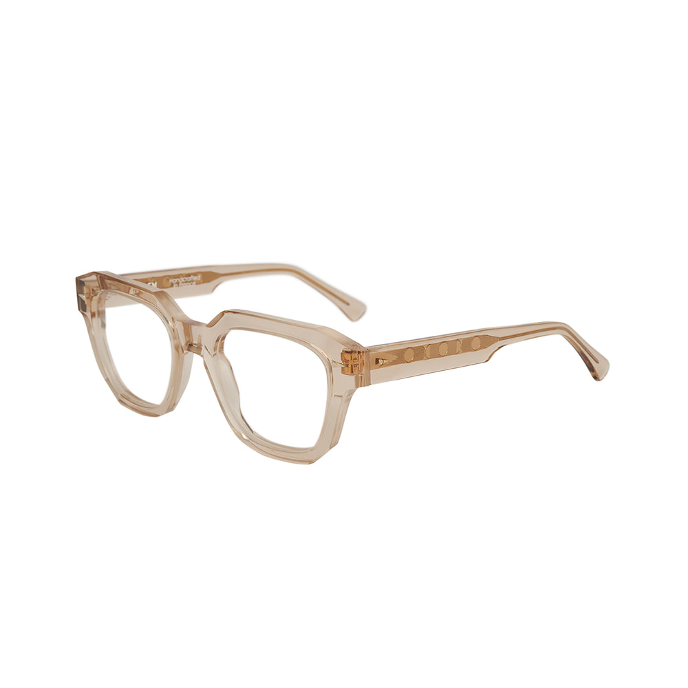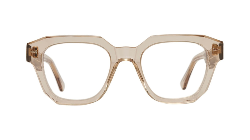 A sophisticated pair of thick-framed eyeglasses in a translucent champagne/light brown color. The frames feature a bold geometric square silhouette with straight clean lines and prominent angles. The design is minimalist yet makes a statement with its architectural inspiration and premium acetate construction. The transparent brown tint of the frame material adds a subtle sophistication while maintaining a contemporary aesthetic. The chunky temple arms match the front frames substantial presence, creating a cohesive high-end look suitable for both professional and fashion-forward settings.