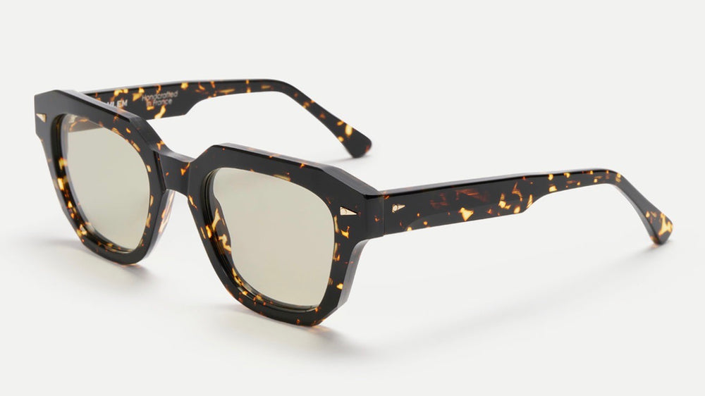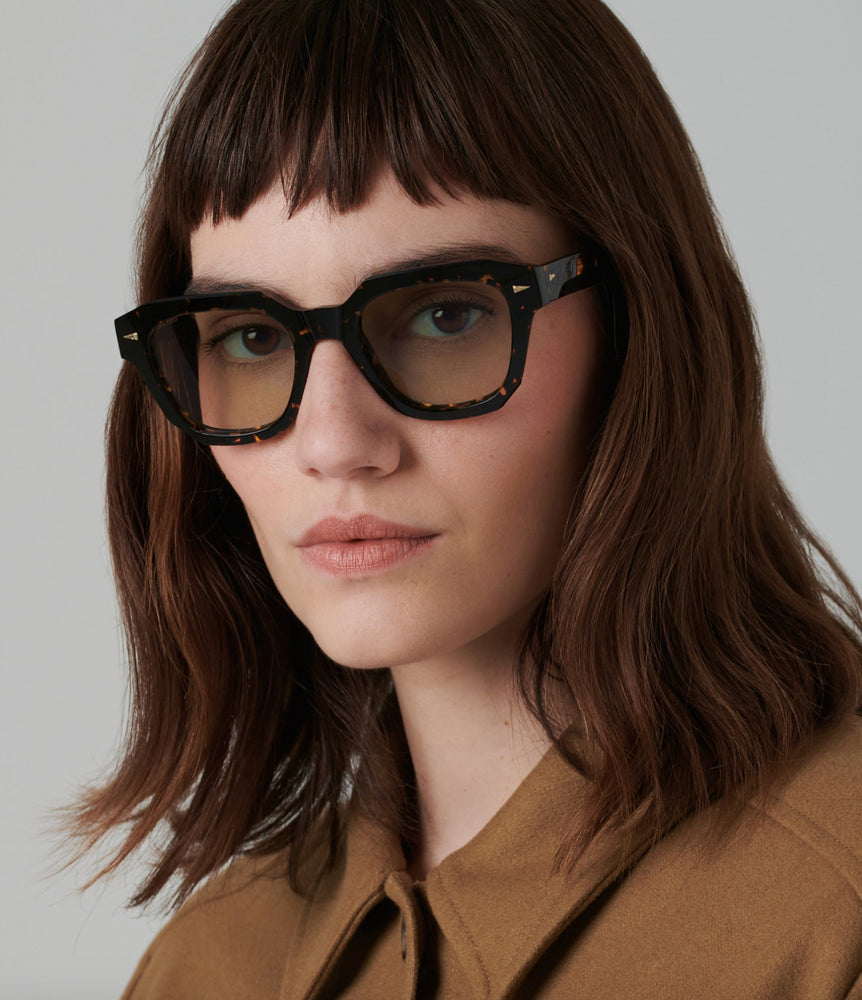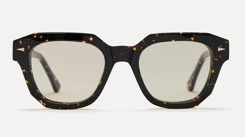Classic oversized geometric frames in a sophisticated dark tortoiseshell pattern with subtle amber flecks. The substantial acetate construction features bold, architectural lines and squared-off edges that create a distinctive silhouette. Small metallic arrow details accent the front corners, adding a refined touch to these intellectual, fashion-forward frames. The wide temples maintain the substantial profile while the saddle bridge provides comfortable fit.