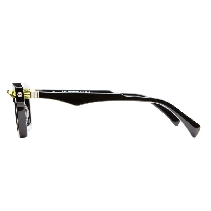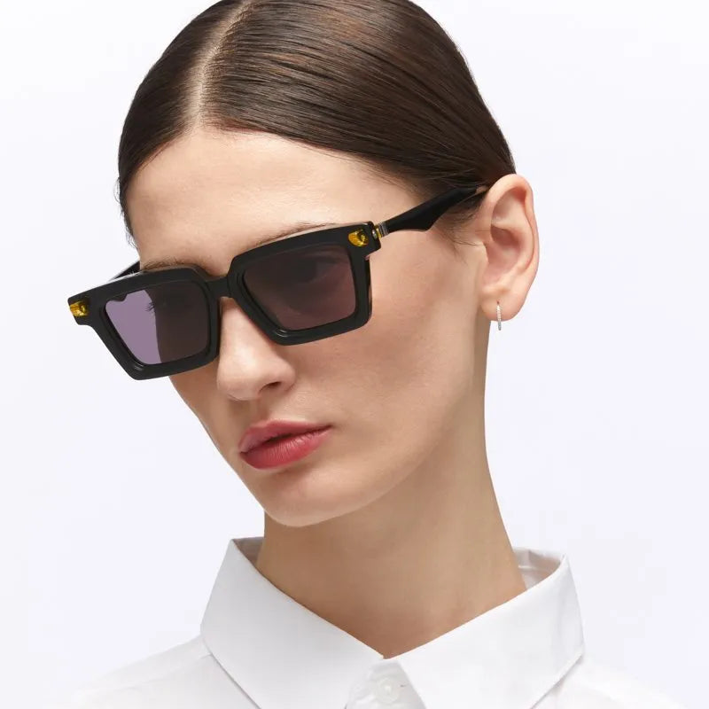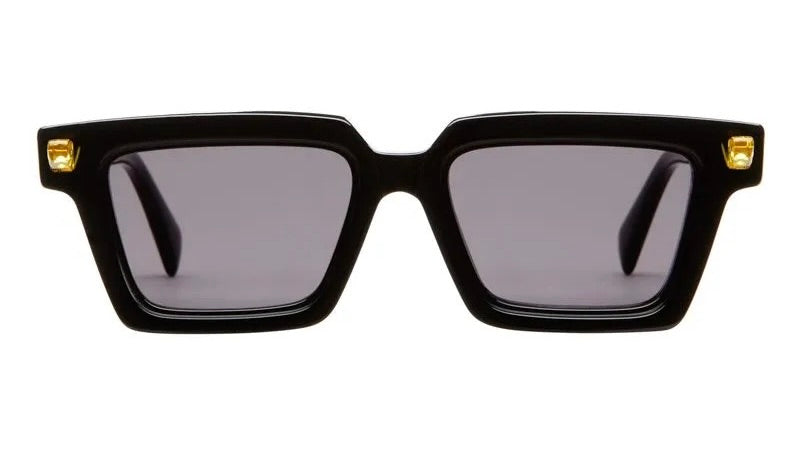 Bold, oversized square sunglasses with a chunky geometric profile. Features a distinctive thick black acetate frame with an architectural, avant-garde aesthetic. Small gold-tone metal accents at the front corners add subtle luxury detailing. The wide temple arms and substantial bridge create a strong, statement-making silhouette. The grey lenses complement the frames modern, minimalist design. These sunglasses embody a contemporary high-fashion aesthetic with their dramatic proportions and sharp angular lines.