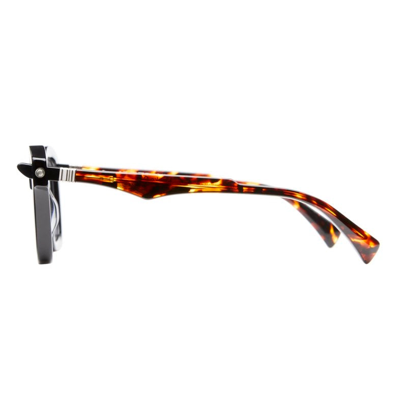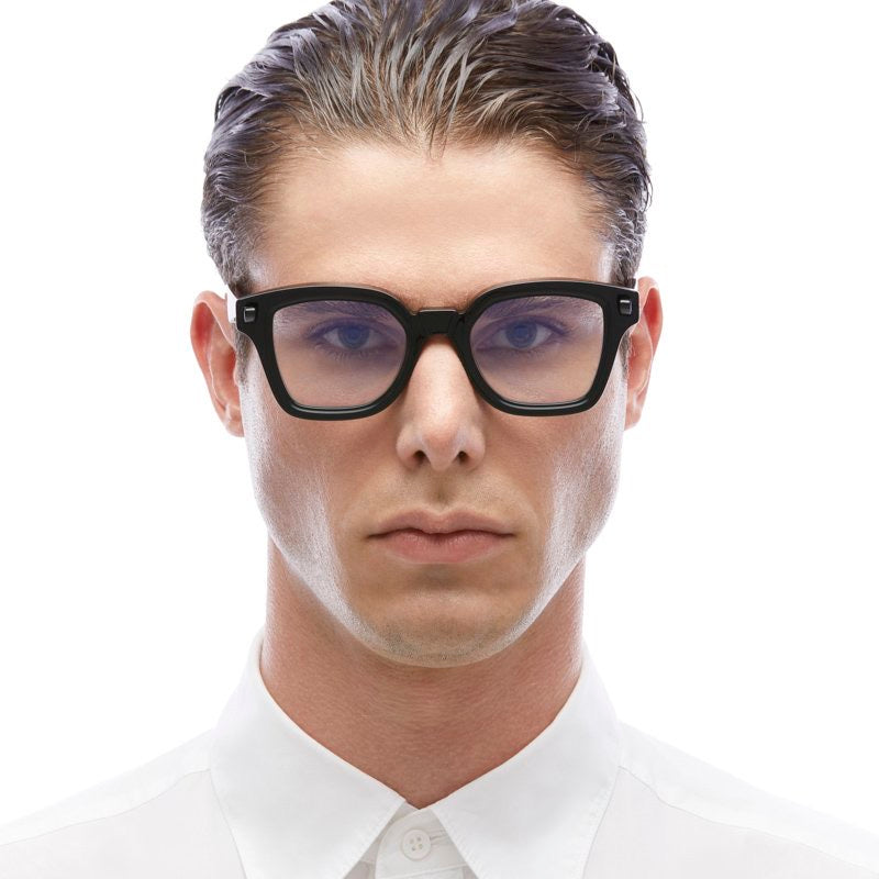 These bold statement glasses feature a chunky geometric square frame with substantial thickness. The frames have a modern, avant-garde aesthetic with sharp angles and a pronounced silhouette. The design is minimalist yet striking, with clean lines and a solid black colorway throughout. The frames appear to be made from high-quality acetate with a matte finish. The distinctive chunky design would make these glasses a strong fashion statement piece while maintaining functionality.