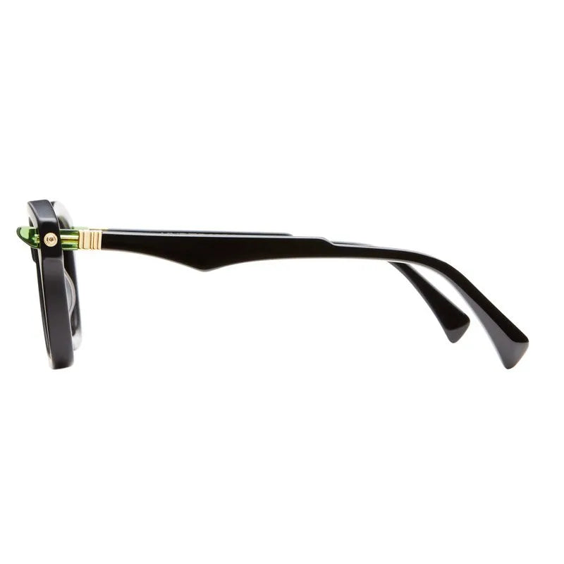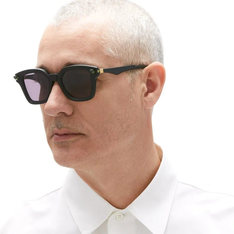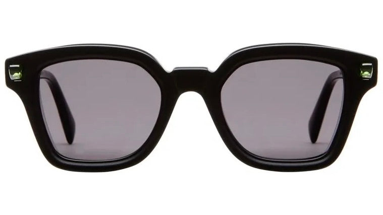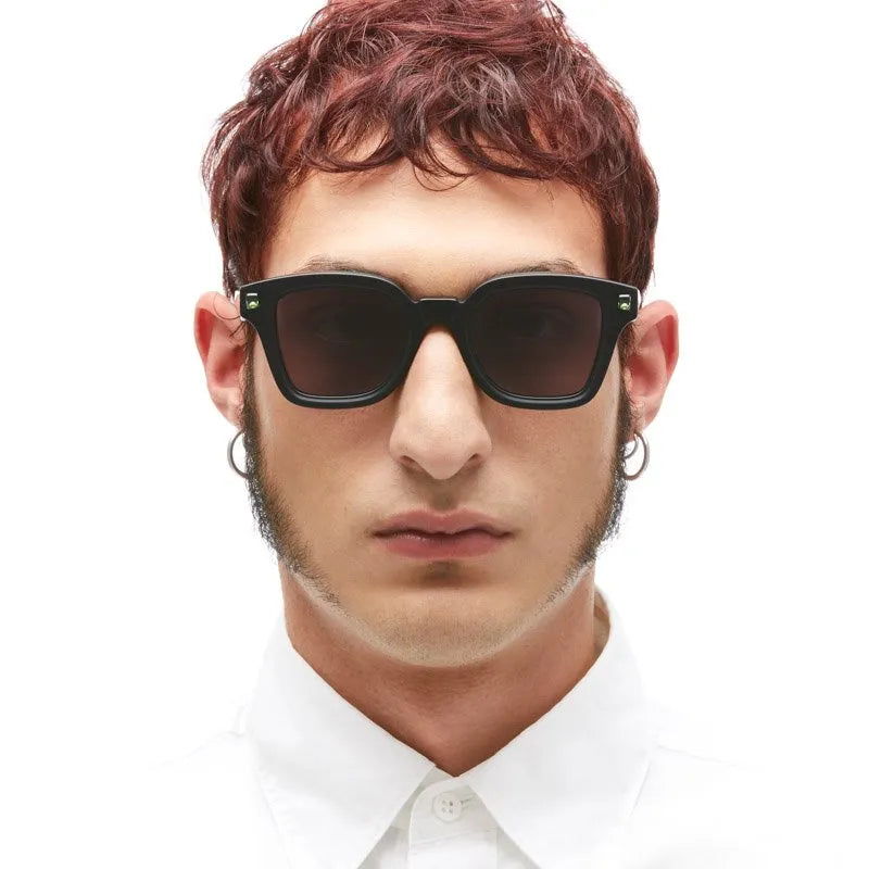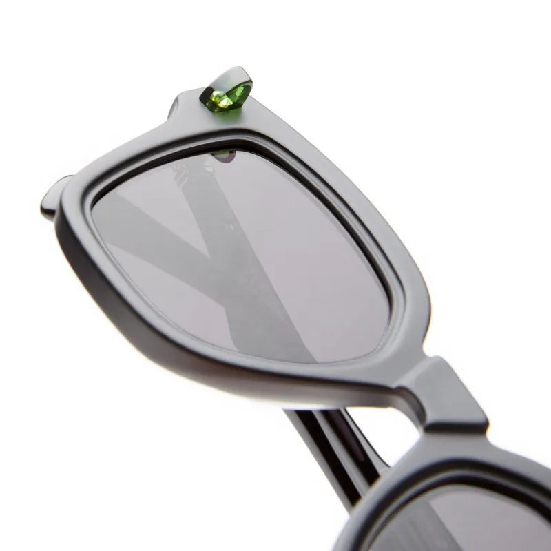 These are bold, contemporary designer sunglasses featuring a chunky square frame design with an architectural feel. The frames have a substantial, statement-making presence with their thick black acetate construction. The lenses are a sleek grey tint that provides excellent sun protection while maintaining a sophisticated look. Small green accent details can be seen on the front corners, adding a subtle designer touch. The glasses have a strong geometric presence with sharp, clean lines and a modern interpretation of classic wayfarers. The thick construction suggests durability and premium quality, while the oversized proportions create a fashion-forward, avant-garde aesthetic.