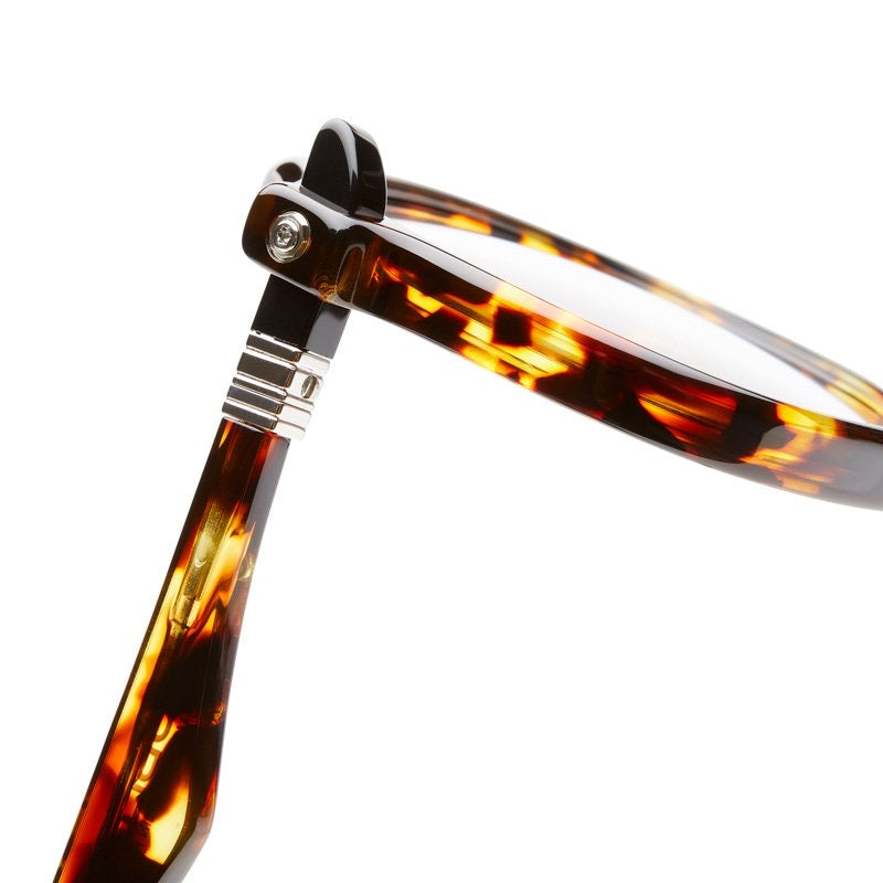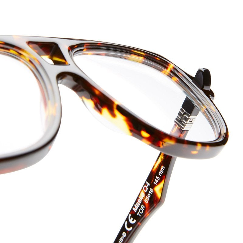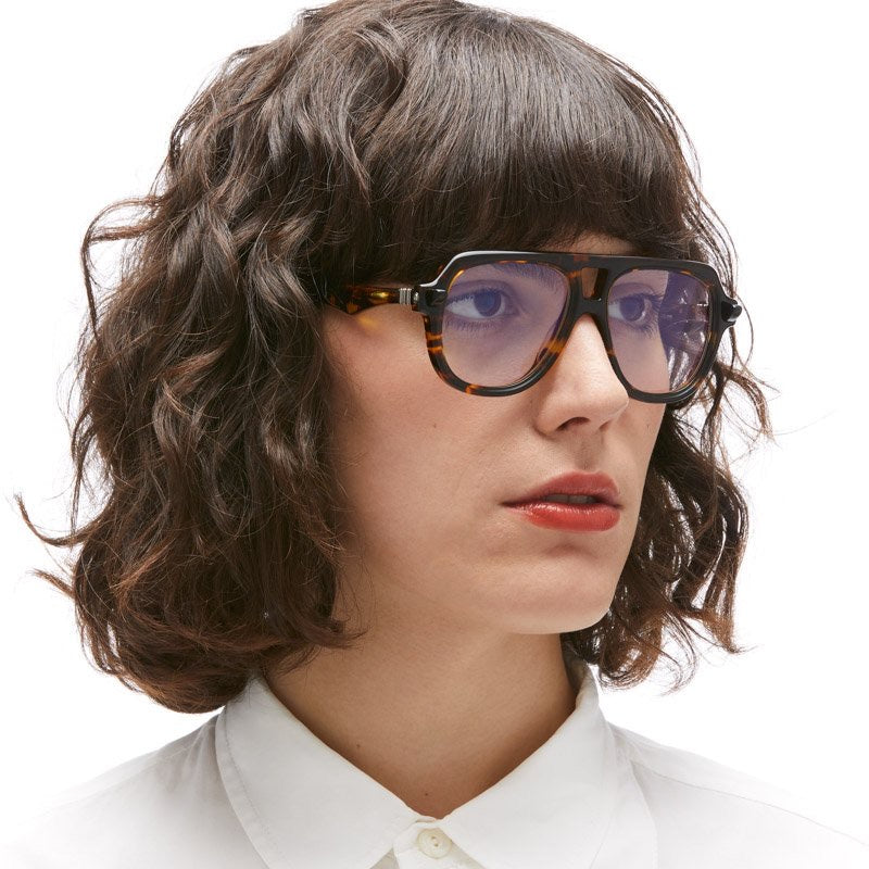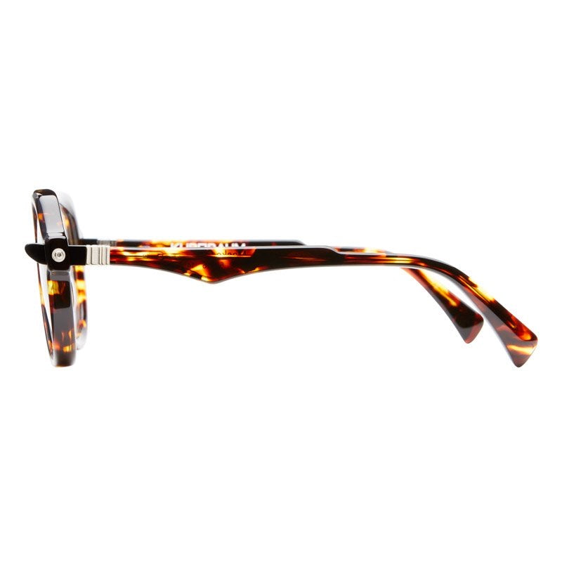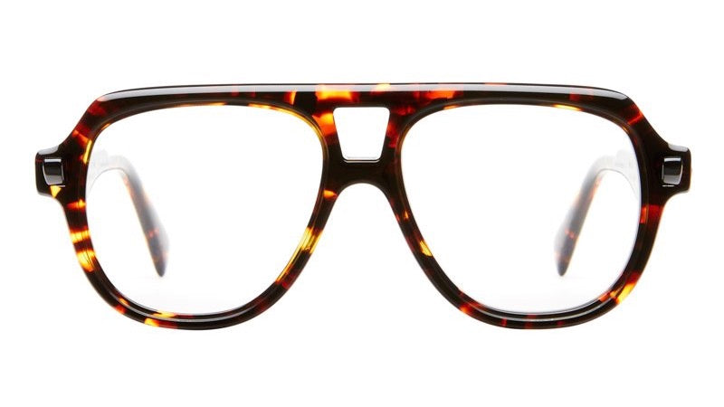 These oversized aviator-style glasses feature a bold tortoiseshell acetate frame with a distinctive retro-futuristic design. The frame exhibits rich amber and dark brown tones in a marbled pattern. The glasses have a prominent brow bar and bridge, creating a strong architectural statement. The temples are substantial and match the front frames tortoise coloring. The overall aesthetic is both vintage-inspired and contemporary, making for a striking intellectual look that would suit a variety of face shapes.