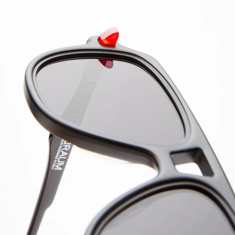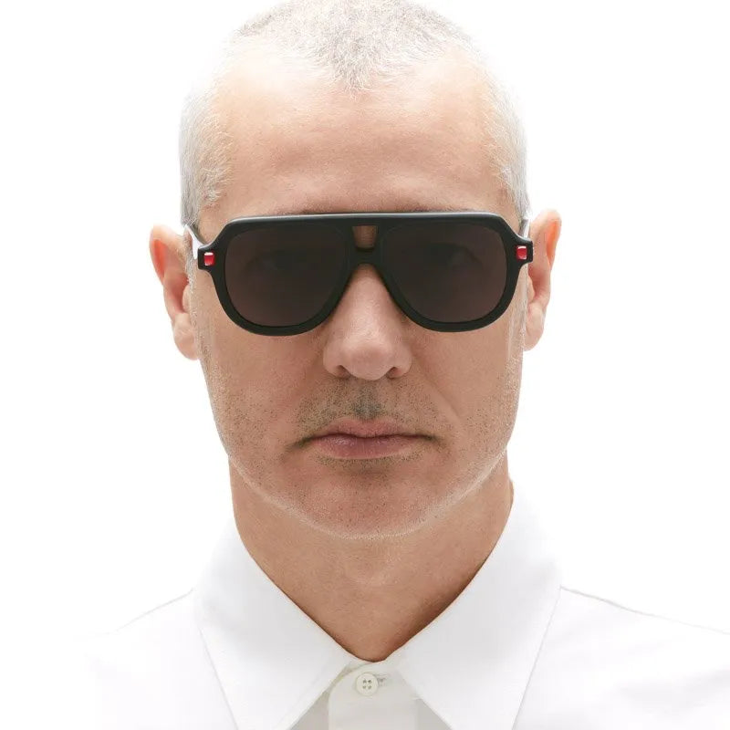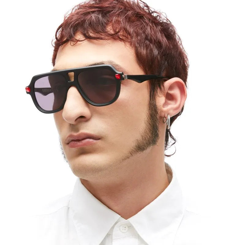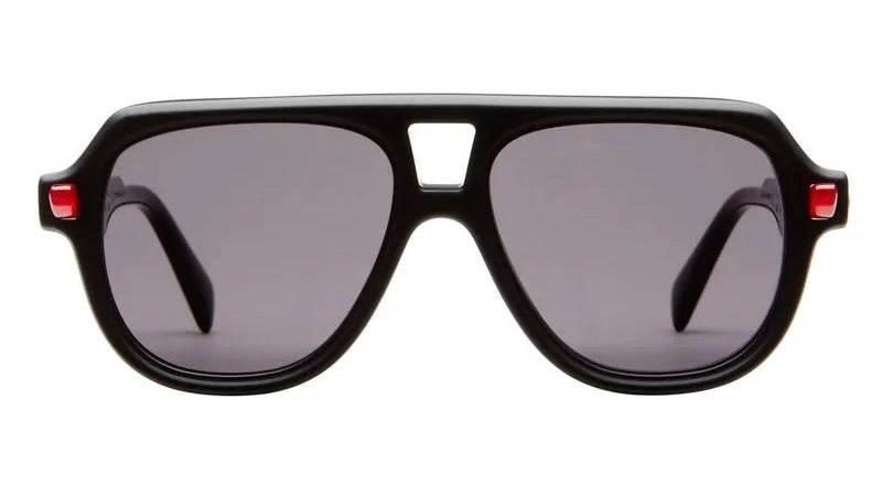 These are bold, statement-making aviator sunglasses with an oversized silhouette and thick black plastic construction. The frame features a distinctive bridge design and chunky proportions that give it a strong, architectural presence. Notable red accents appear on the sides of the frame. The grey-tinted lenses are fitted within the substantial frame, creating a dramatic look that balances retro aviator styling with contemporary chunky design elements. The overall aesthetic is bold and fashion-forward, suitable for those looking to make a strong style statement.