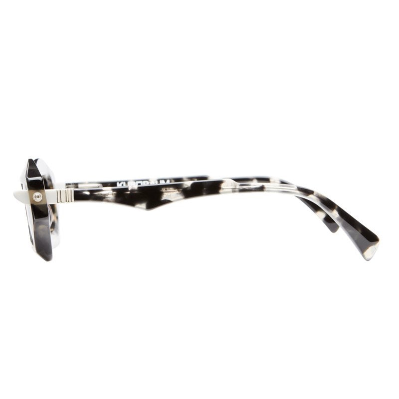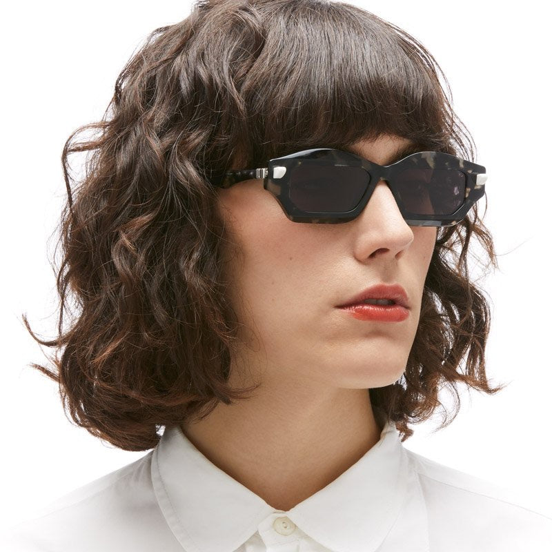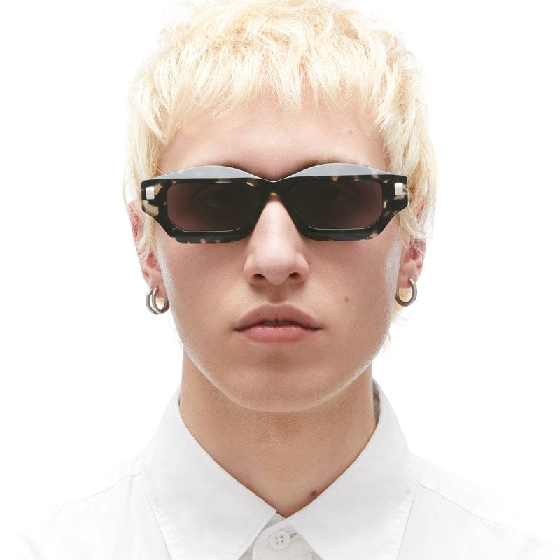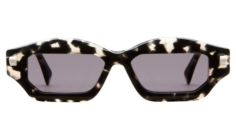 These bold geometric sunglasses feature a striking black and cream tortoiseshell pattern across thick acetate frames. The angular, avant-garde shape has strong geometric lines and a substantial presence. The frames have a contemporary architectural feel with their chunky, rectangular-inspired silhouette. Dark grey lenses provide strong sun protection while complementing the dramatic frame design. The overall aesthetic is high-fashion and statement-making, perfect for the fashion-forward individual seeking unique eyewear.