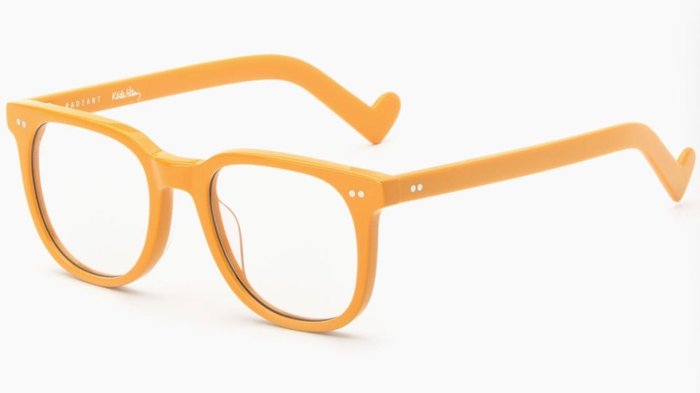The AKILA RADIANT RX x KEITH HARING features a distinctively modern square silhouette in a warm honey-orange color. The frame exhibits a uniform matte finish with subtle curved temple arms and classic proportions. The eyewear has a contemporary minimalist aesthetic while maintaining professional functionality. The chunky acetate construction gives it a substantial yet refined presence, ideal for everyday wear.