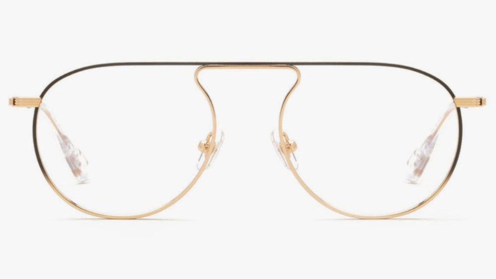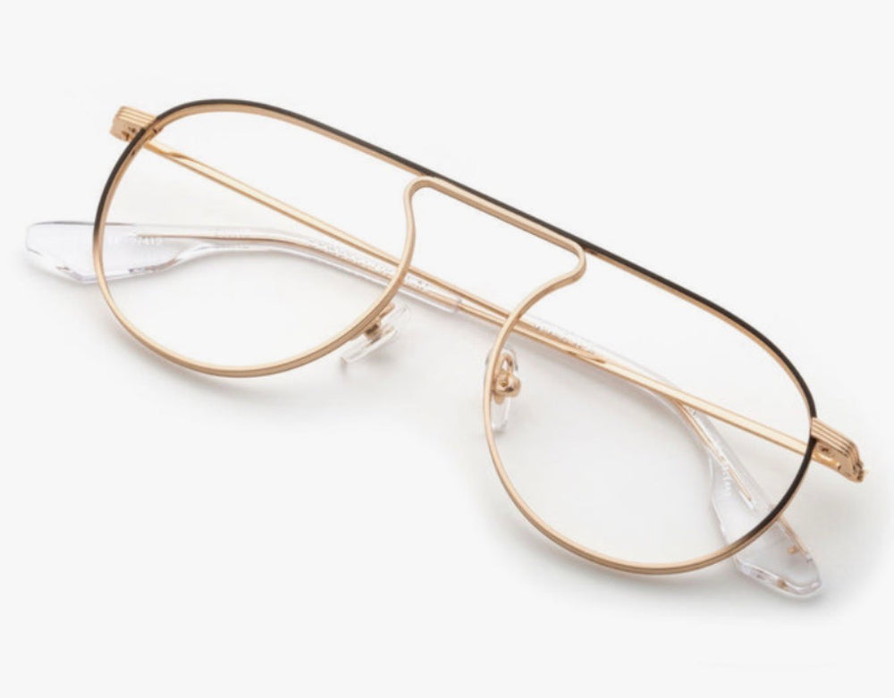 These elegant aviator-style glasses feature a refined gold metal frame with a sleek profile. The classic aviator silhouette is given a contemporary update with thin rims and nose bridge. The frame has clear lenses and subtle gold-toned hardware throughout. The nose pads and slender temple arms create a lightweight, comfortable fit. The design strikes a perfect balance between vintage inspiration and modern sophistication.