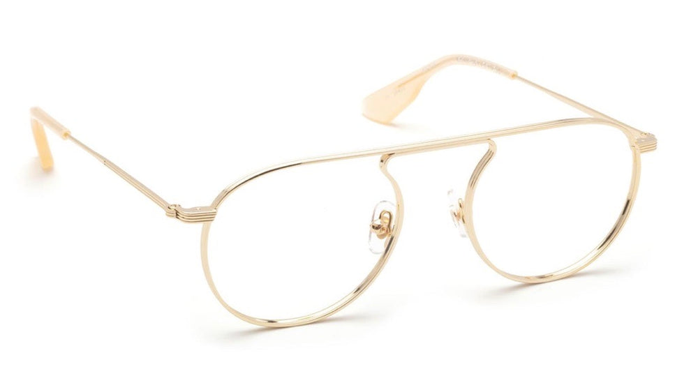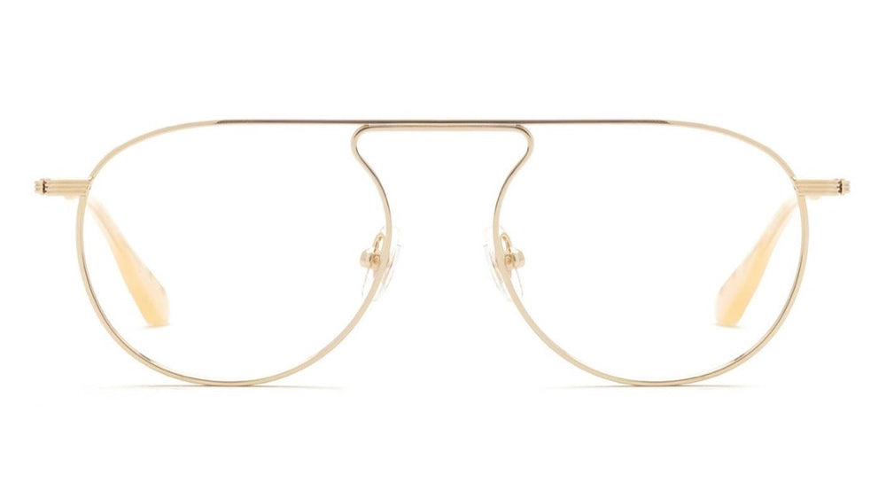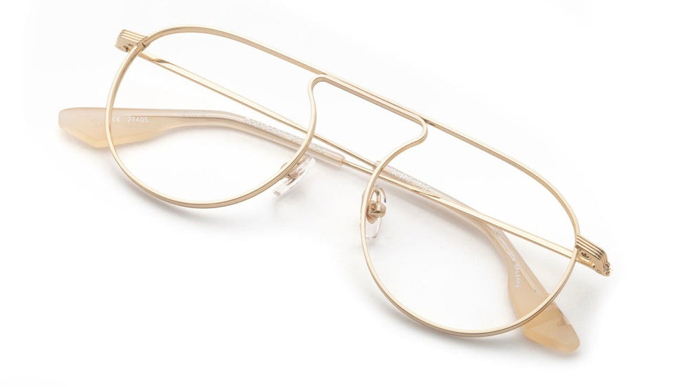 A refined aviator-style frame with a sleek double-bridge design in polished gold metal. The frame features a classic teardrop-shaped lens silhouette with thin rims and delicate nose pads. The temples are slim and streamlined, matching the elegant gold finish of the front frame. The overall design strikes a perfect balance between vintage aviator aesthetics and modern minimalism, making it a versatile choice for contemporary eyewear.