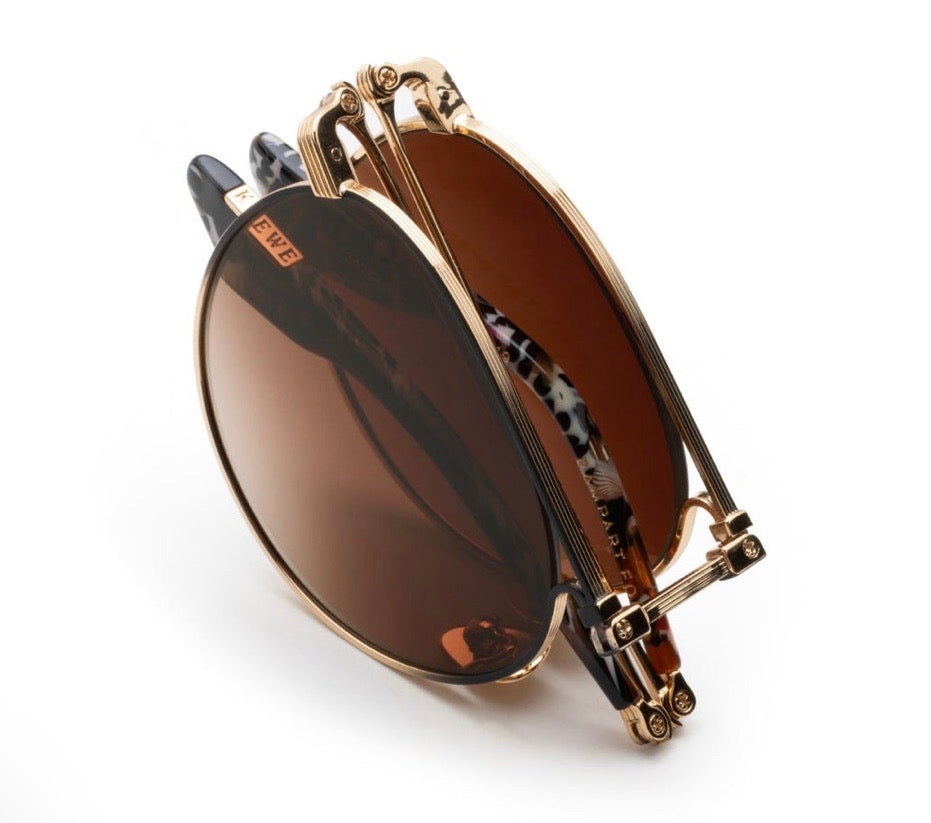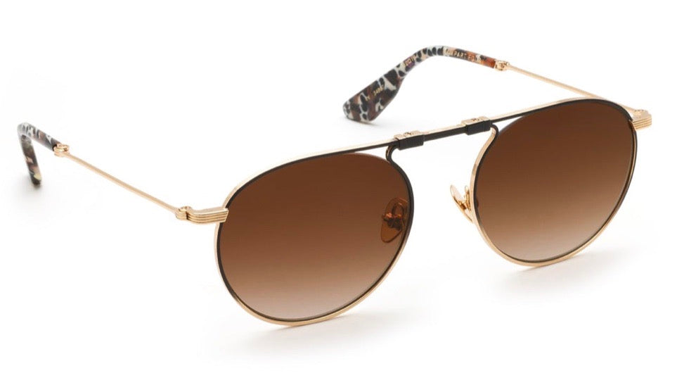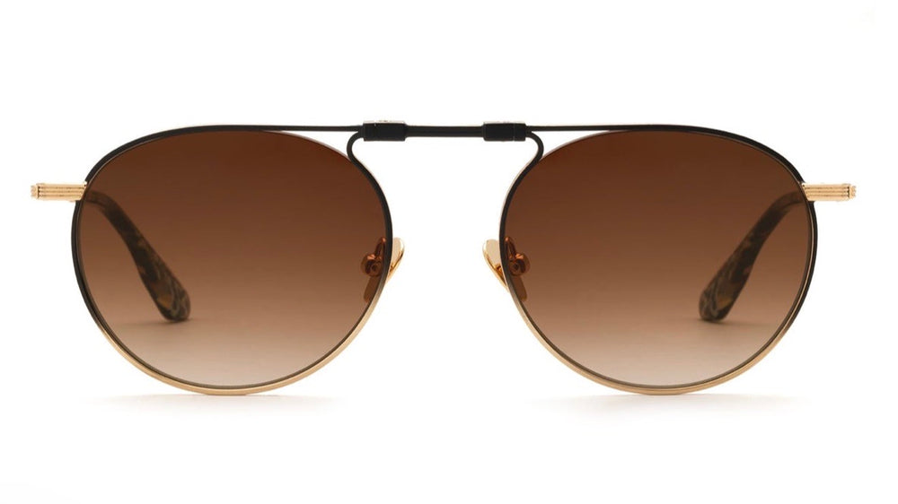 Classic aviator-style sunglasses with a sophisticated gold and black metal frame construction featuring a unique foldable design. The sunglasses showcase gradient brown lenses and delicate nose pads for comfort. The double bridge adds a distinctive architectural element, while the slim profile maintains an elegant appearance. The temple arms feature a coordinated gold finish with what appears to be textured end pieces.