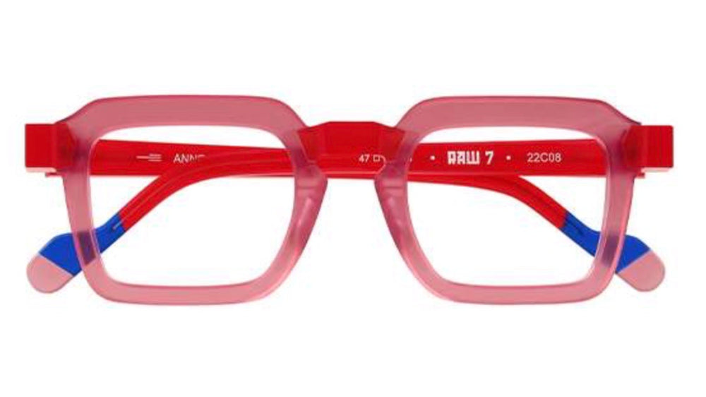 Bold geometric eyewear featuring a striking translucent pink acetate frame with a thick, architectural design. The frame showcases distinctive square-like angles and strong geometric lines, creating an avant-garde aesthetic. The temples transition from red to bright blue tips, adding a playful color contrast. The chunky, contemporary design has a substantial presence while maintaining a modern, artistic appeal typical of high-end European eyewear. The bridge features a strong saddle design that complements the bold frame structure.