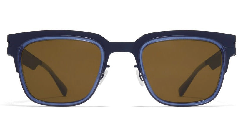 These sleek metal sunglasses feature a contemporary square silhouette with a deep navy blue frame and brown-tinted lenses. The design incorporates a modern double-layered effect around the frame front, creating an interesting architectural detail. The construction appears robust yet refined, with clean lines and a minimalist aesthetic typical of modern eyewear design. The nose pads and temple arms are integrated seamlessly into the overall design, maintaining the sophisticated look. The sunglasses have a versatile, urban appeal that would complement both casual and formal attire.