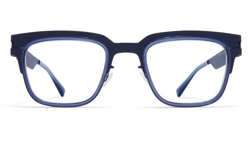 These are sophisticated square-framed glasses featuring a modern metallic construction in a striking navy blue colorway. The frames have a contemporary architectural design with clean lines and a minimalist aesthetic. The glasses showcase a distinctive layered construction at the corners and temples, adding subtle depth to the design. The frame combines durability with lightweight comfort, making them suitable for everyday wear. The transparent lenses are housed in a sleek metal frame that demonstrates excellent craftsmanship, especially visible in the precise engineering of the nose bridge and temple hinges.