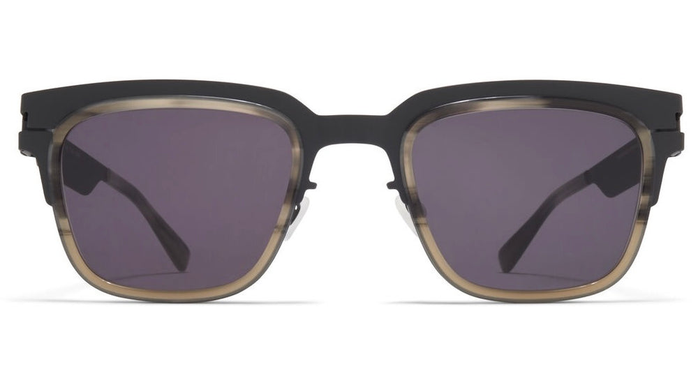 A sophisticated pair of rectangular sunglasses featuring a two-tone design with a black metal upper frame that transitions into a translucent tortoise-like lower portion. The frames have a modern, architectural aesthetic with clean lines and a sleek profile. The purple-tinted lenses create a striking contrast against the frame, while the metal construction suggests durability and premium quality. The design strikes a perfect balance between contemporary fashion and timeless style, making it suitable for various face shapes and occasions. The nose pads appear to be adjustable for comfort, and the overall construction demonstrates precision engineering typical of high-end eyewear.