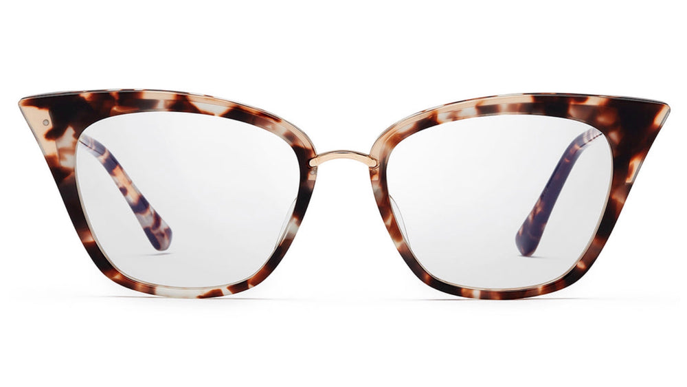 Elegant cat-eye glasses featuring a sophisticated tortoiseshell acetate frame with subtle variations in brown and amber tones. The frames dramatic upswept corners are balanced by delicate gold metal bridge detailing. The design showcases a modern interpretation of vintage glamour with its angular silhouette and mixed material construction. The transparent lenses are complemented by slim temples that maintain the frames refined aesthetic.