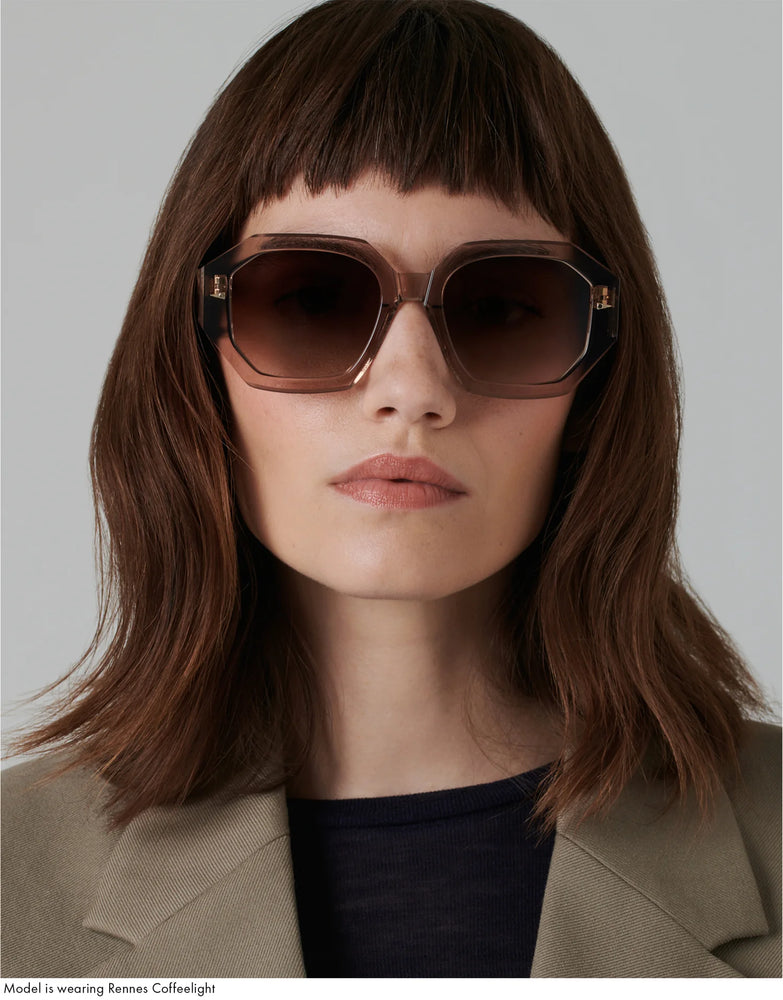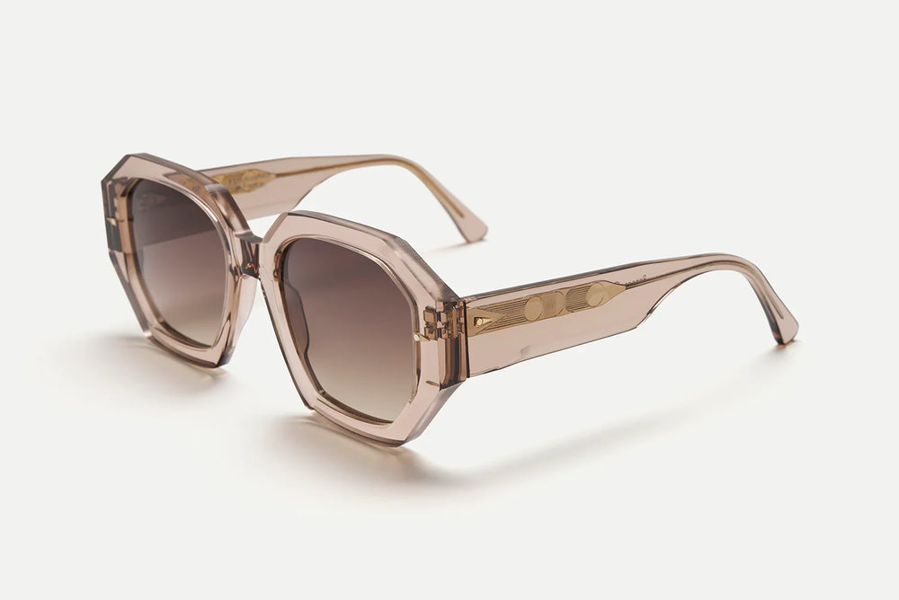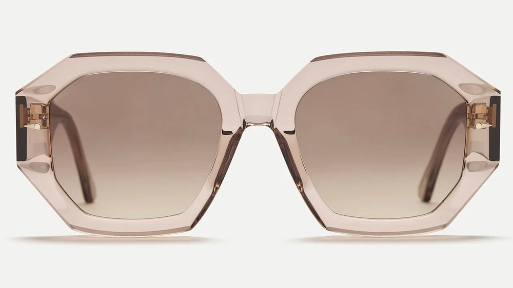 These elegant oversized geometric sunglasses feature a translucent pink acetate frame with a modern, architectural aesthetic. The chunky angular design creates bold lines while maintaining a light, airy feel through the transparent material. Gold-toned hinges add subtle metallic accents. The gradient lenses complement the frames rosy hue, transitioning from darker to lighter tones. The design balances contemporary geometric shapes with feminine softness through its color choice and translucent material.