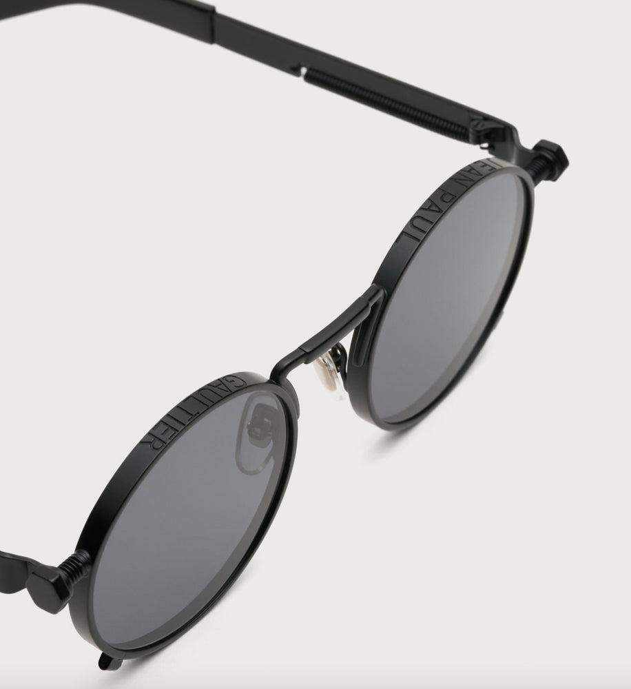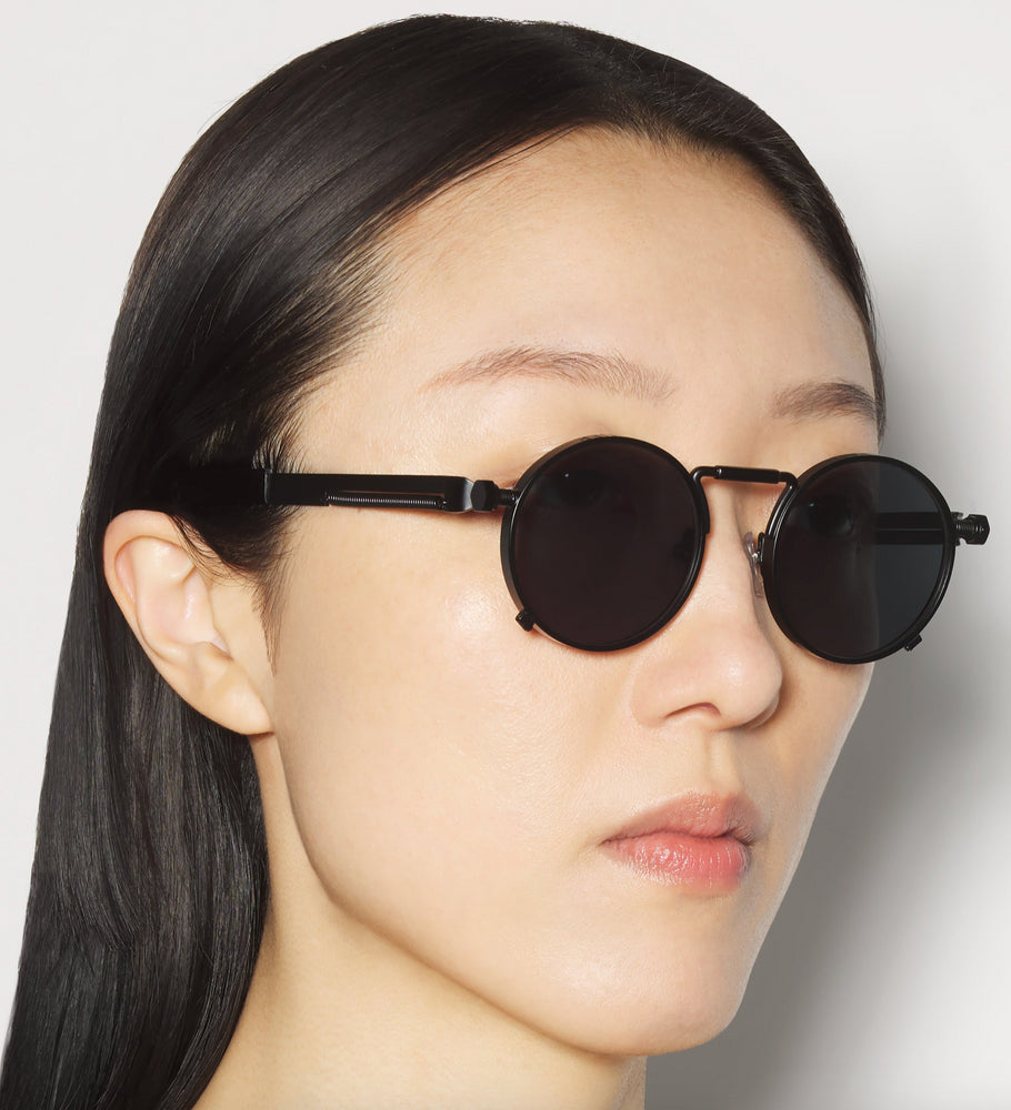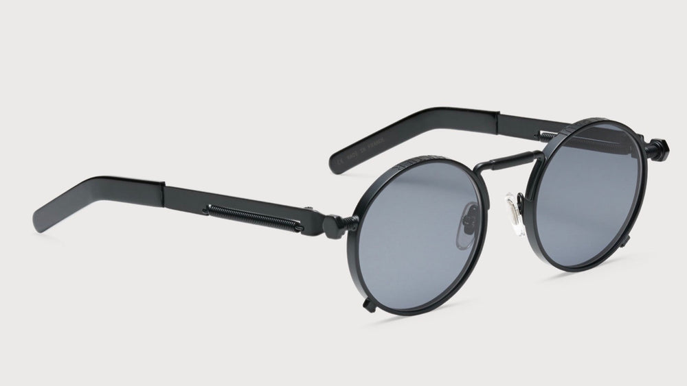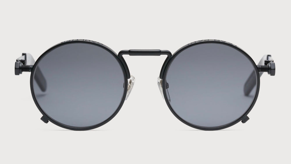 These striking round sunglasses feature a sophisticated steampunk-inspired design with distinctive mechanical details at the temples. The frame has a matte black finish with industrial-looking screws and components that add character to the classic circular silhouette. The dark grey lenses are complemented by the sleek metal construction, creating a bold yet refined aesthetic. Notable features include adjustable nose pads and unique spring-loaded temple hinges that enhance both style and functionality. The overall design strikes a perfect balance between vintage and modern elements.