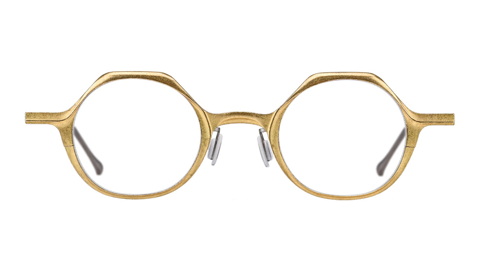 Distinctive handcrafted round frames made from premium brushed copper with a luxurious matte gold finish. Features a minimalist design with slim nose pads and clean lines throughout. The circular lenses are perfectly balanced by the architectural metal construction, creating a sophisticated vintage-inspired look. The frame has a subtle texture from the brushed metal treatment that adds depth and character.