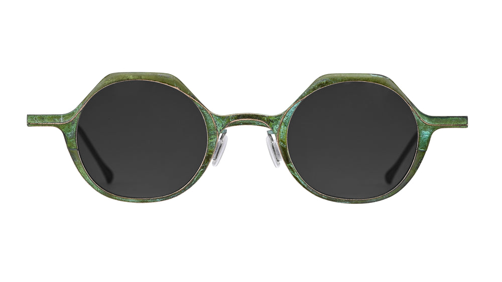These distinctive round sunglasses feature a unique patinated copper frame with a striking verdigris green finish, giving them an artisanal, weathered appearance. The frames have a sophisticated geometric interpretation of the classic round shape with subtle angular elements. The dark lenses provide a stark contrast against the oxidized metal frame. The design showcases expert metalwork with an industrial-meets-vintage aesthetic, perfect for the fashion-forward individual who appreciates artisanal craftsmanship.