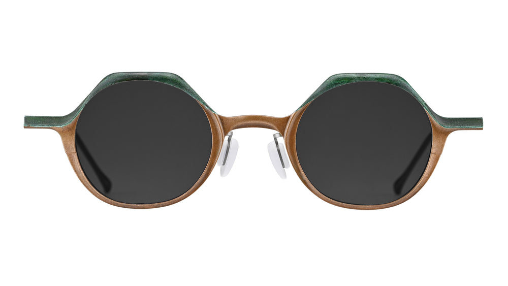 These distinctive round sunglasses feature a unique two-tone design with bronze/copper-colored frames and forest green temple arms and upper rim accents. The frames have an industrial, artisanal quality with a carefully crafted metalwork aesthetic. The dark lenses are complemented by the warm metallic tones of the frame. The design demonstrates excellent attention to detail in the bridge construction and temple arm joints, creating a sophisticated, avant-garde look that combines vintage inspiration with contemporary styling.
