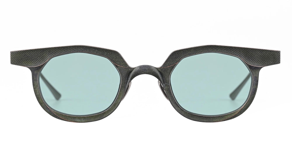 The RIGARDS RG1002TI presents a distinctive industrial aesthetic with its thick titanium construction featuring a textured, cross-hatched pattern on the upper frame. The sunglasses showcase a vintage-inspired round silhouette with a weathered, gunmetal grey finish that gives them a raw, architectural quality. The lenses are a cool mint green tint, complementing the industrial design. The frames have a substantial, sculptural presence while maintaining a refined, artistic sensibility that speaks to contemporary urban style.