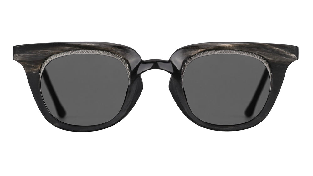 These distinctive sunglasses feature a bold geometric shape with a contemporary twist. The frame has a unique textured finish with subtle wood-like grain patterns along the top rim. The design combines classic elements with modern styling, featuring dark grey lenses and a substantial but not overwhelming frame thickness. The overall aesthetic is sophisticated and avant-garde, with clean lines and a balanced proportion that would suit various face shapes. The sunglasses exhibit a premium quality construction with attention to detail in the finishing.
