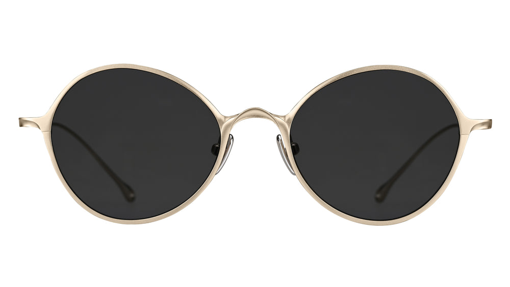 Sophisticated titanium round frame sunglasses featuring a minimalist design with delicate gold-toned metal construction. The sleek profile is complemented by slim temple arms and nose pads for a comfortable fit. The dark black lenses create a striking contrast against the light metallic frame, offering a timeless and elegant aesthetic suitable for any occasion.