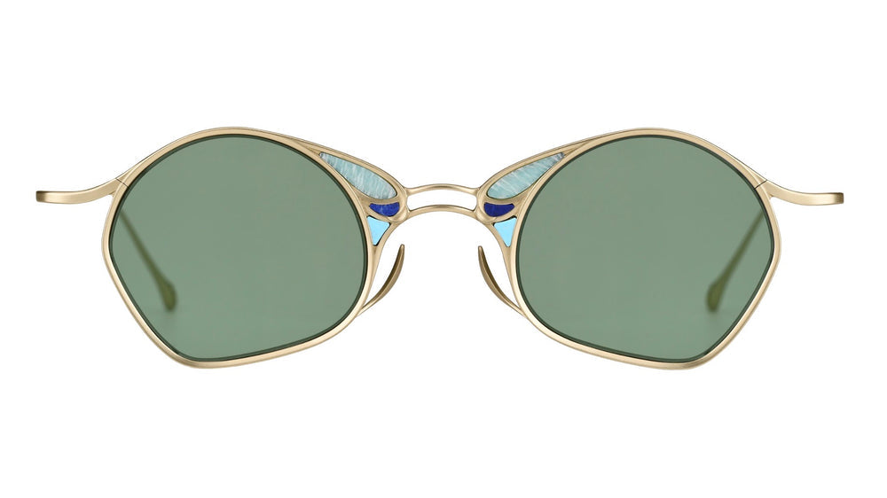 Elegant vintage-inspired oval sunglasses with a delicate gold metal frame. Features distinctive light blue and navy enamel accents near the bridge, creating an artistic detail that adds character. The frame has a refined, minimalist design with sleek temple arms and a classic nose bridge construction. The green-tinted lenses complement the metalwork beautifully, offering a sophisticated blend of retro and contemporary styling. The craftsmanship appears meticulous with smooth curves and well-balanced proportions.
