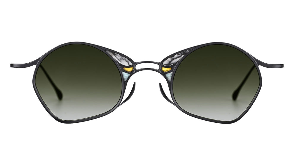 A striking pair of avant-garde geometric sunglasses with an industrial aesthetic. The frames feature an unusual angular shape with distinctive decorative elements near the hinges showing yellow and blue accents. The lenses are gradient green, fading from darker at the top to lighter at the bottom. The metalwork shows excellent craftsmanship with clean lines and precise detailing. The design has a contemporary, artistic quality while maintaining a sophisticated silhouette suitable for fashion-forward individuals.